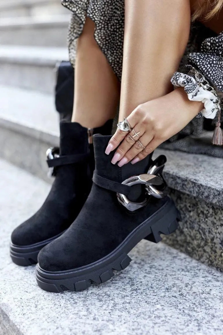 Sztyblety damskie wykonane z eko-zamszu. Wnętrze botków pokryte jest delikatnym ociepleniem w postaci pianki. Zakładanie ułatwi wszyty suwak, natomiast lepsze dopasowanie zapewni guma ściągająca. Cholewka zdobiona dużym łańcuchem, który jest hitem tego sezonu. Możliwość odpięcia zdobienia. Przy wyborze rozmiaru prosimy sugerować się tabelą rozmiarów.