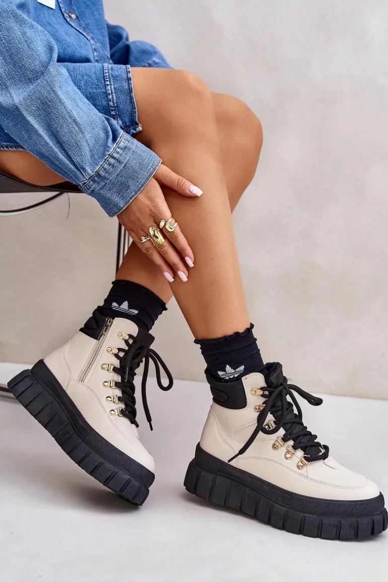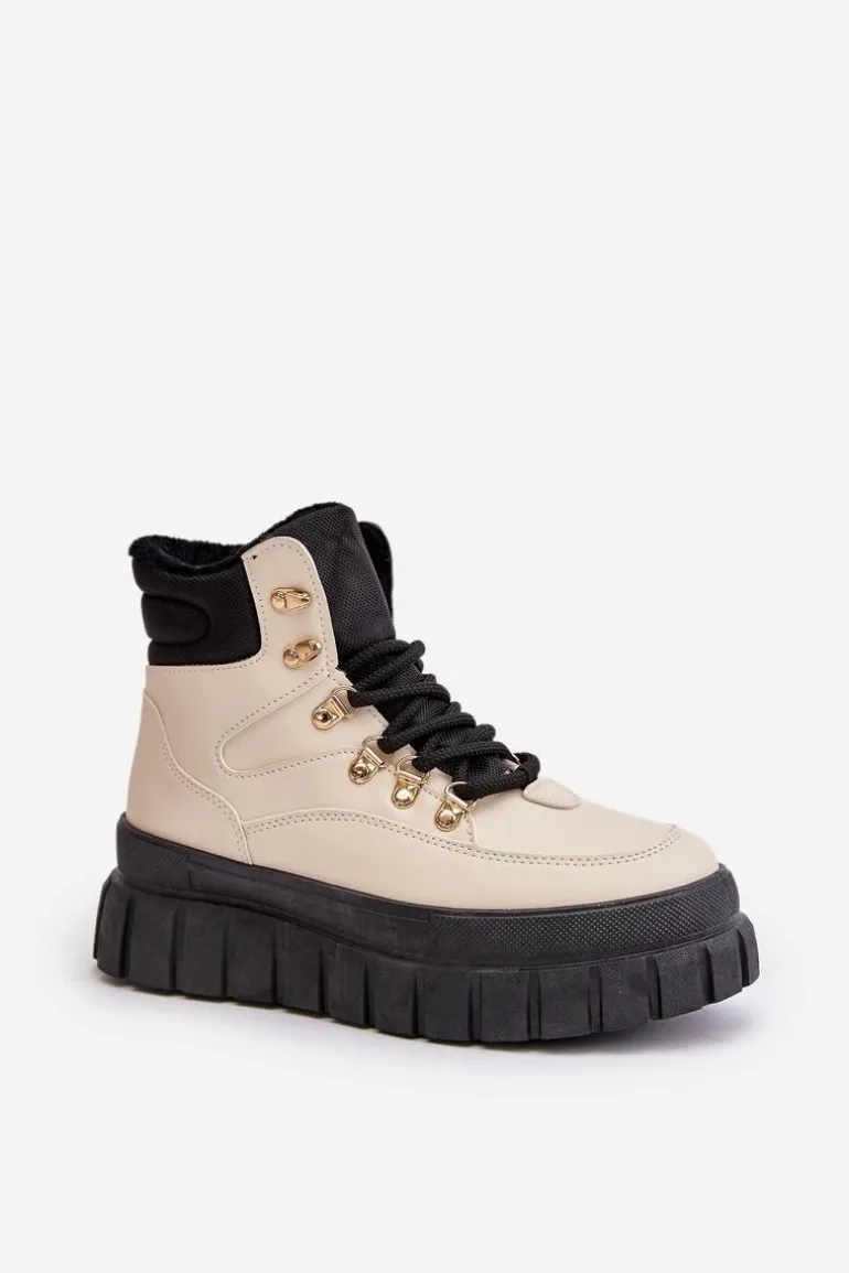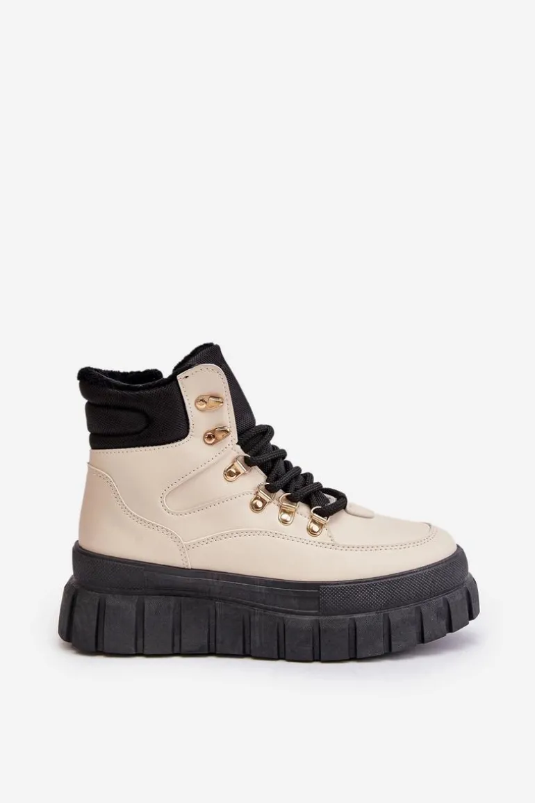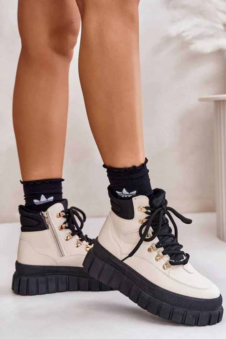 Damskie Ocieplane Botki Trapery Na Platformie Beżowe Jelenia