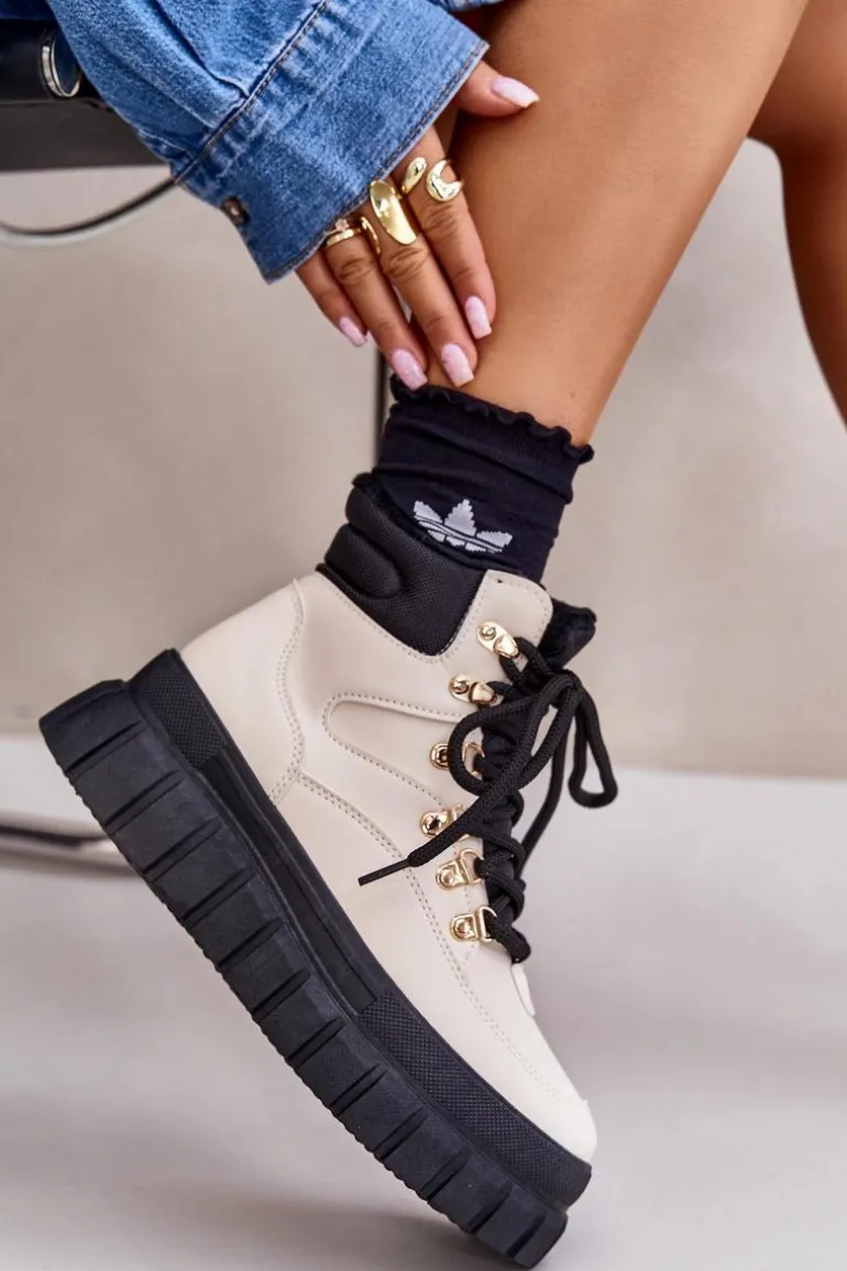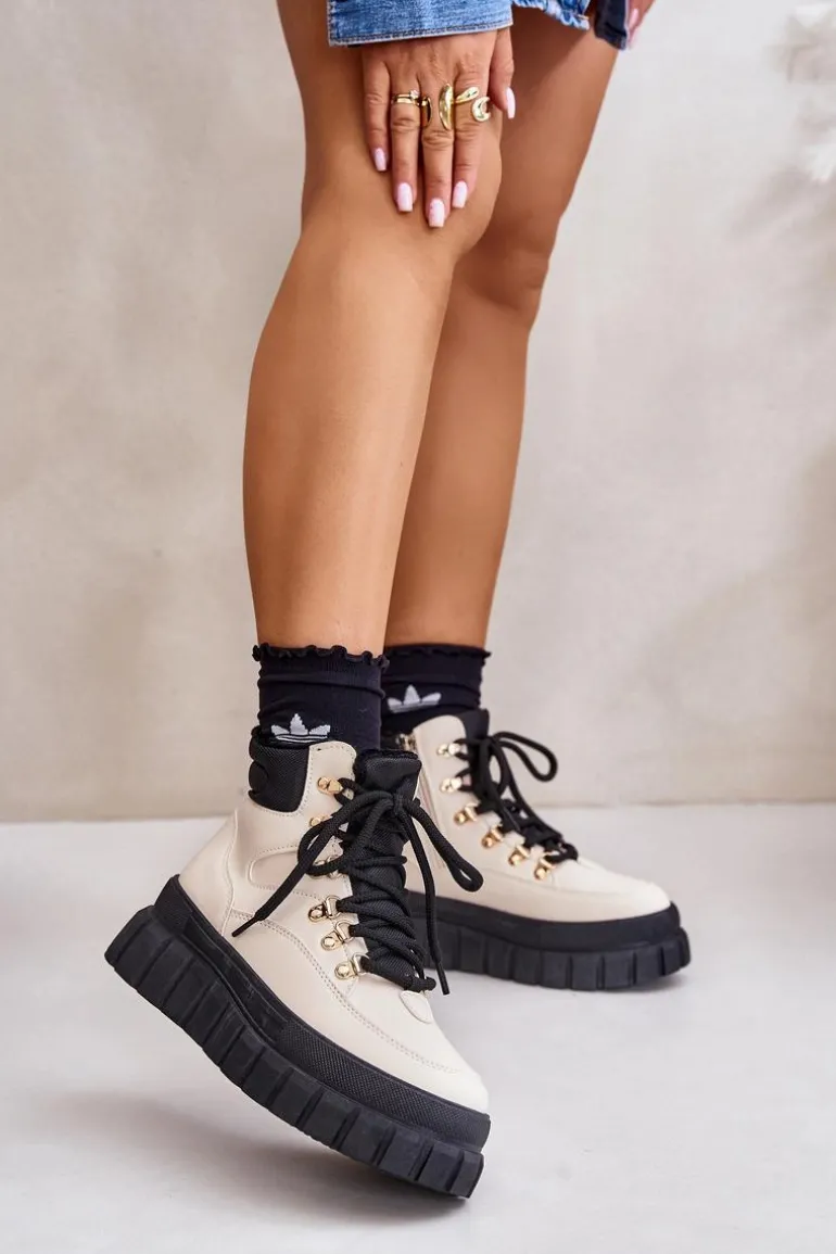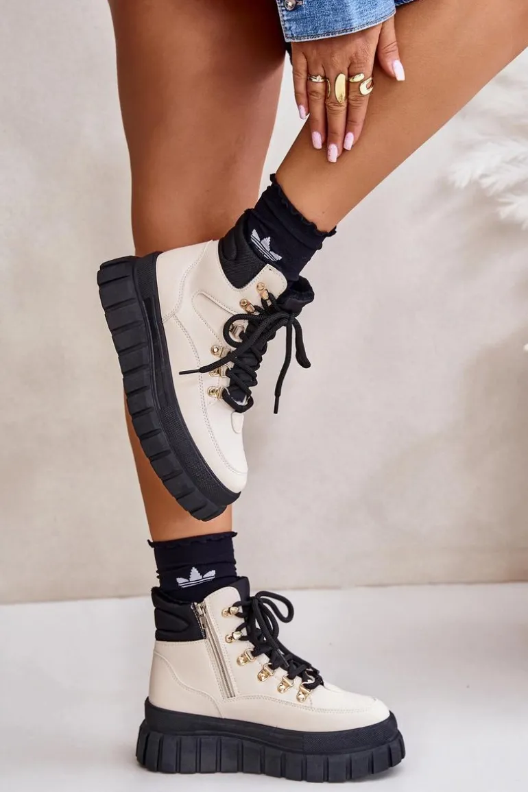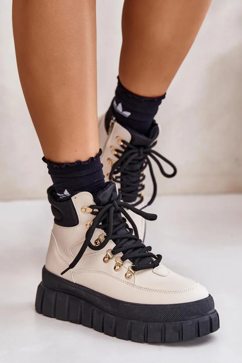 Damskie Ocieplane Botki Trapery Na Platformie Beżowe Jelenia