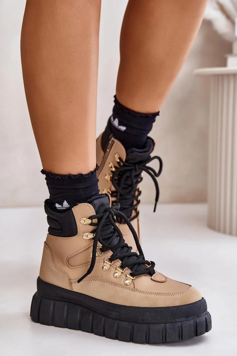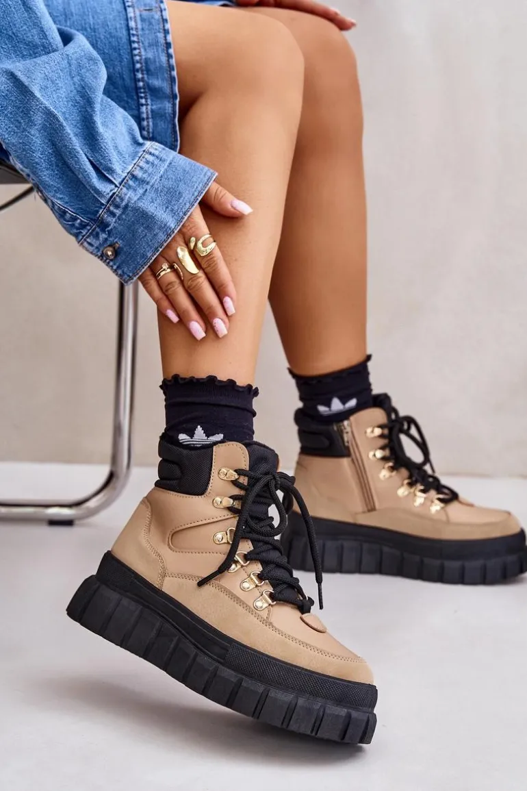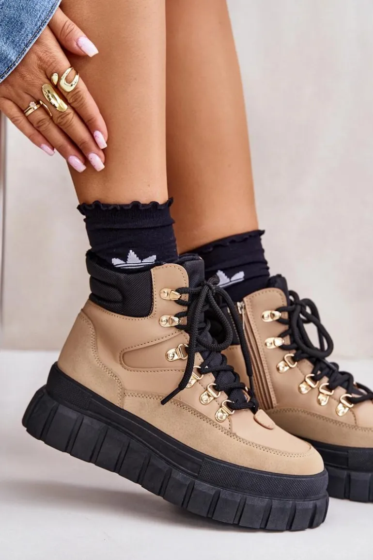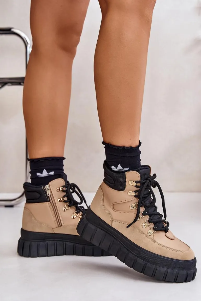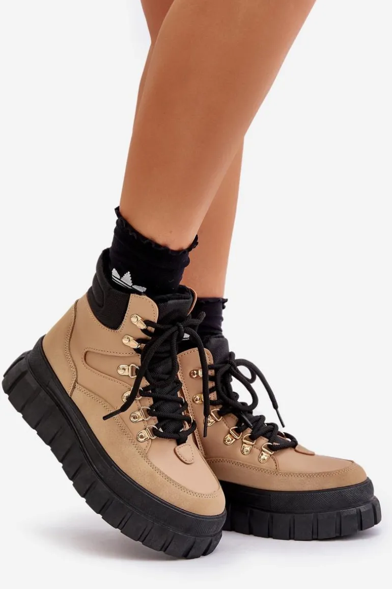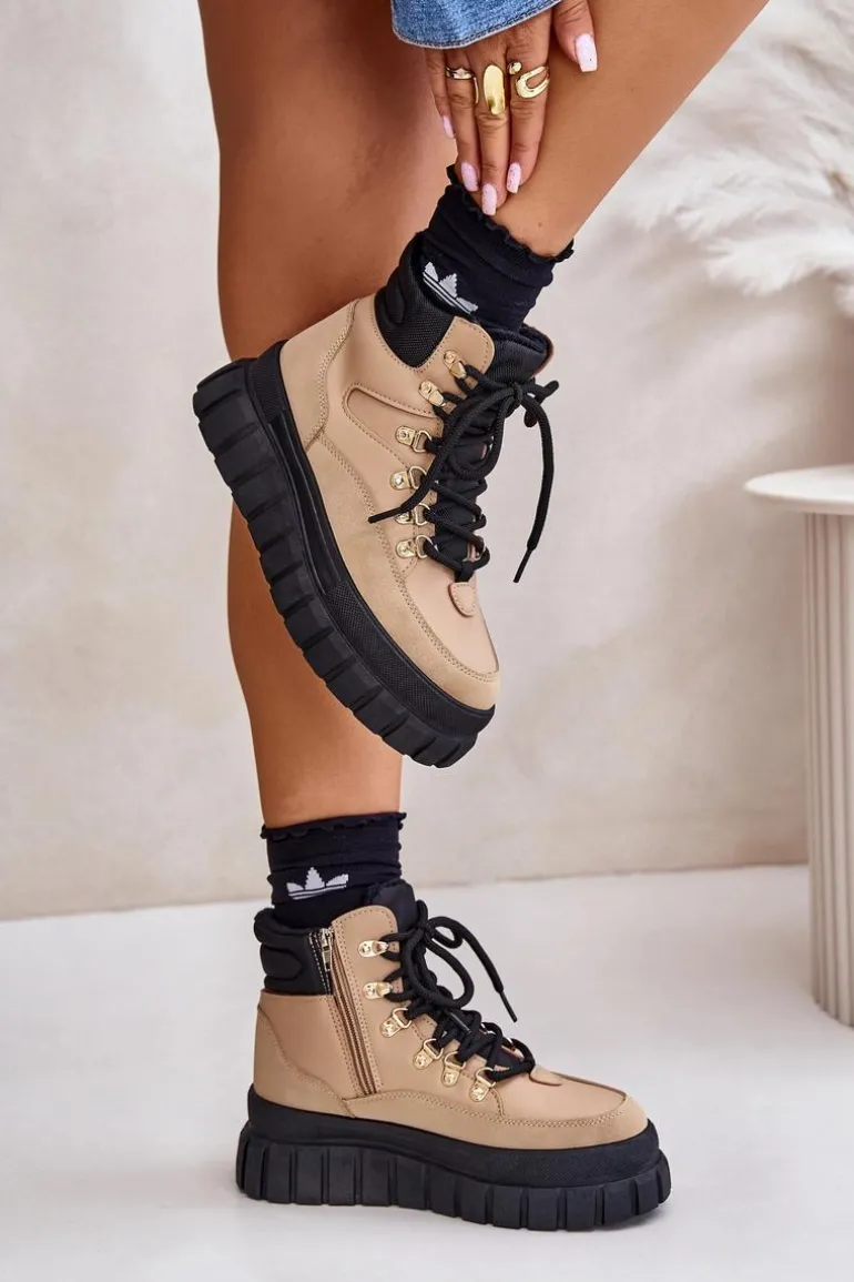 Damskie botki wykonane z eko skóry Osadzone na masywnej platformie, która doskonale odizoluje od zimnego podłoża. Model ten posiada sznurowanie oraz dodatkowe zapięcie na zamek. Ocieplenie w postaci koca obuwniczego zapewni komfort i ciepło. To obuwie, które nie tylko jest stylowe, ale również funkcjonalne. Idealne dla kobiet, które cenią sobie wygodę i modny wygląd. Przy wyborze rozmiaru prosimy sugerować się tabelą rozmiarów.