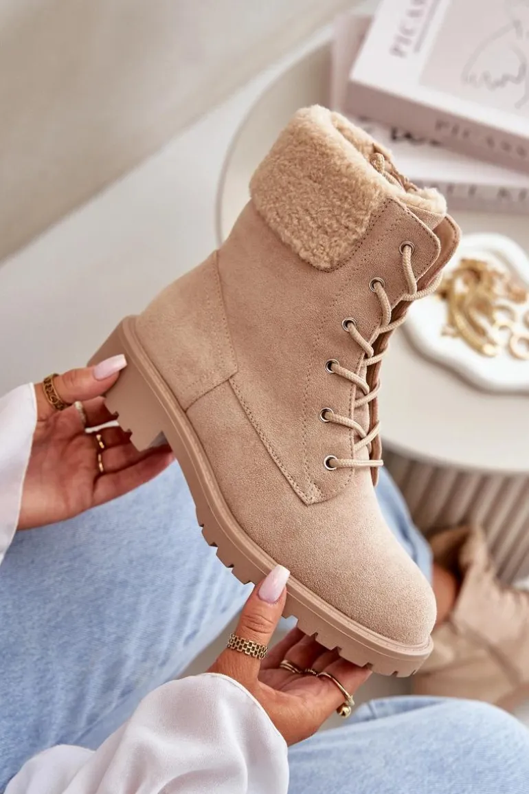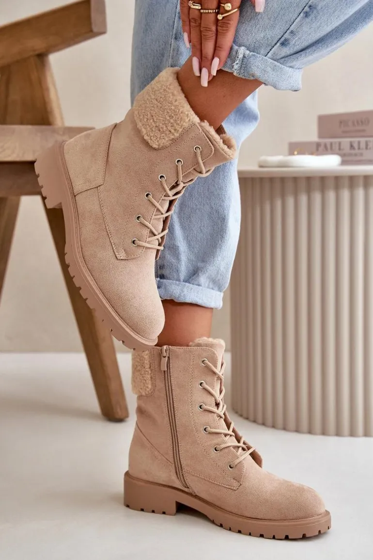 Damskie botki wykonane z miękkiego eko zamszu. Wnętrze ocieplone kocem obuwniczym, co zapewnia komfort w chłodniejsze dni. Góra ozdobiona stylowym kożuszkiem. Model sznurowany, z dodatkowym zapięciem na zamek, co ułatwia zakładanie i dopasowanie do stopy. Idealne na jesienno-zimowe spacery i codzienne stylizacje. Przy wyborze rozmiaru prosimy sugerować się tabelą rozmiarów.