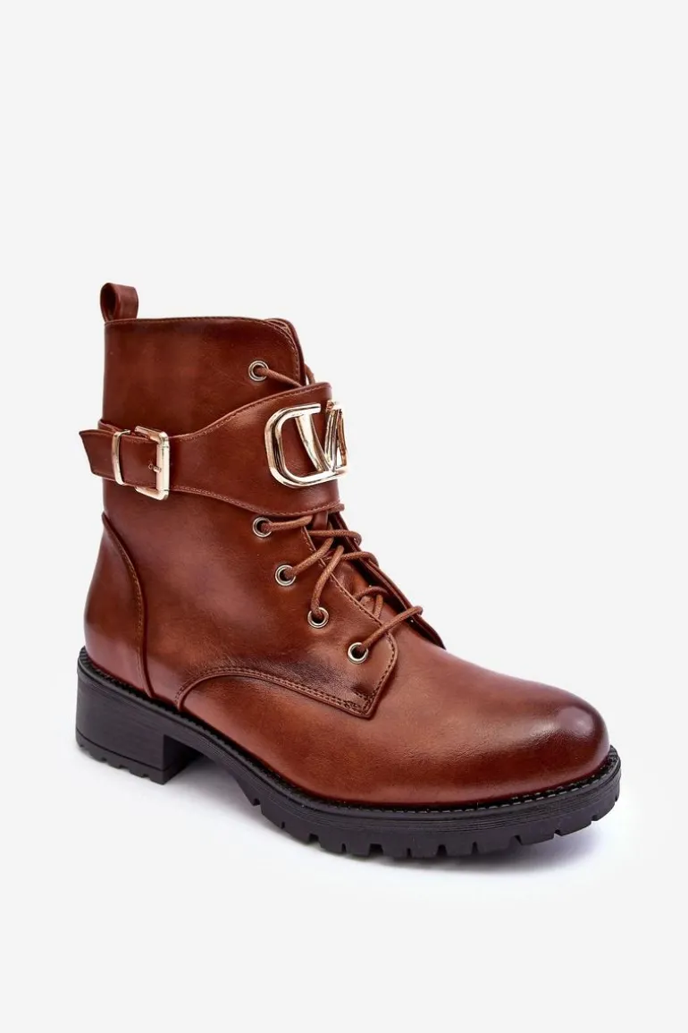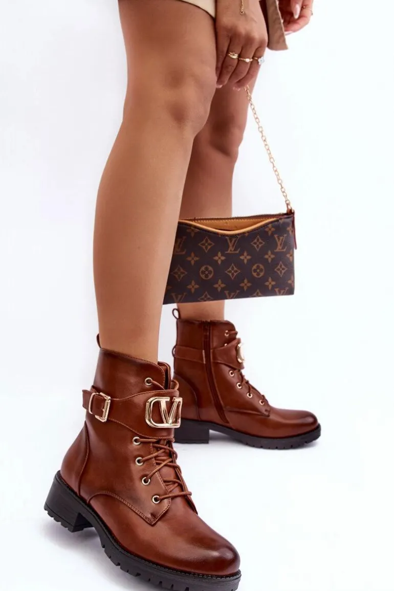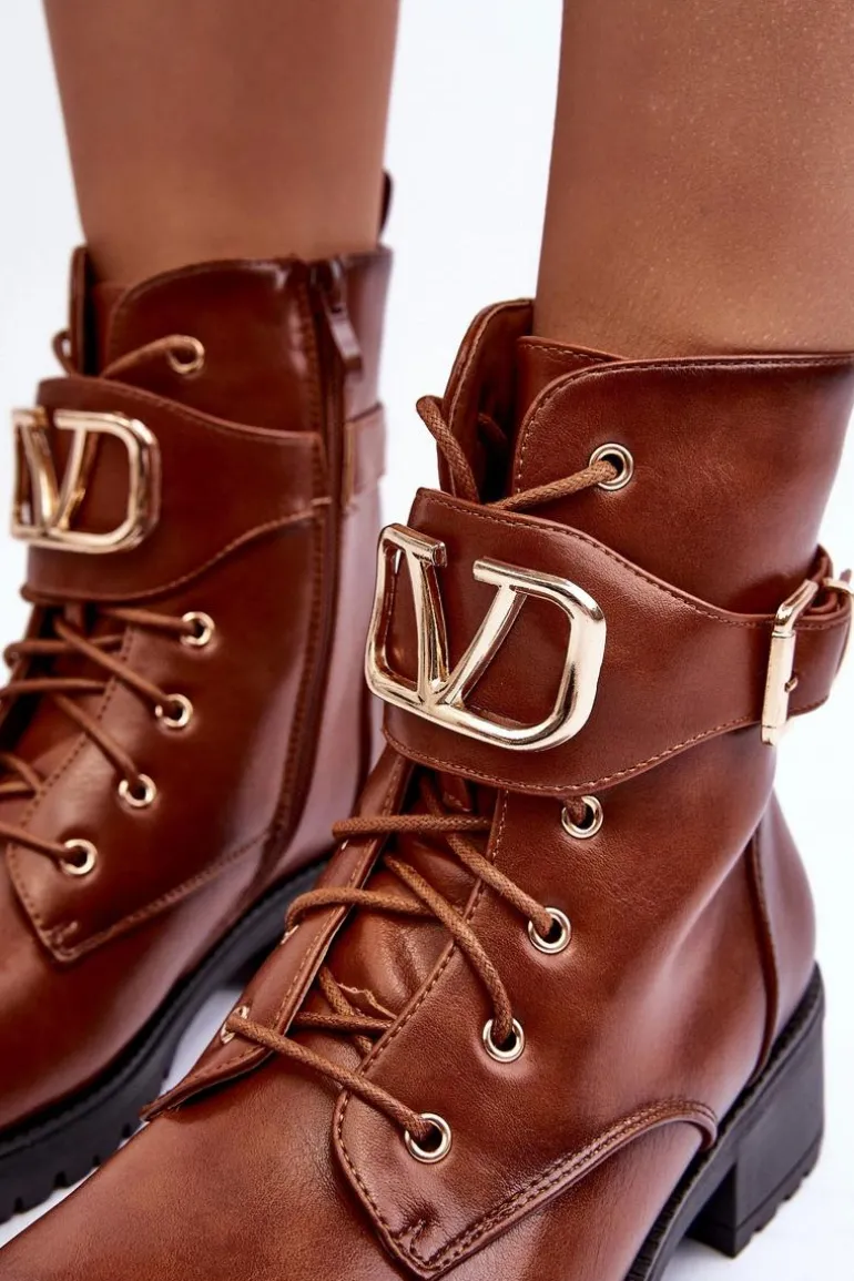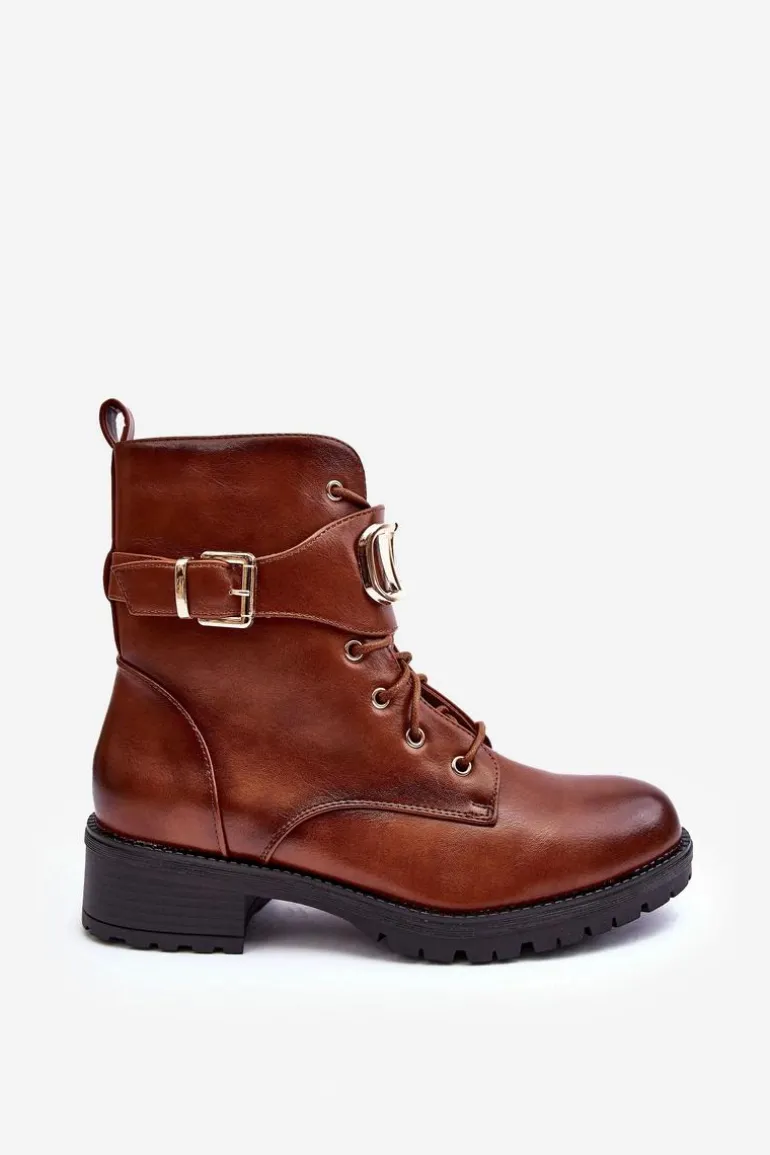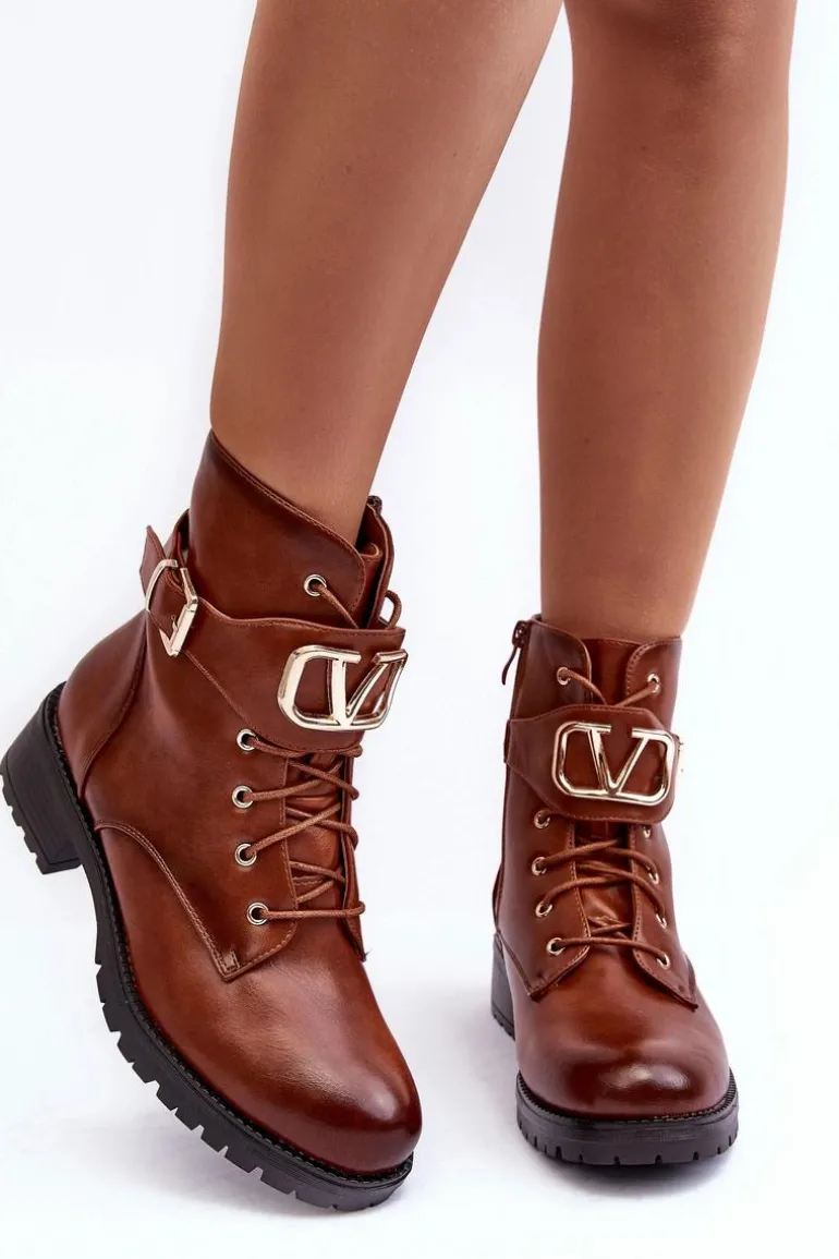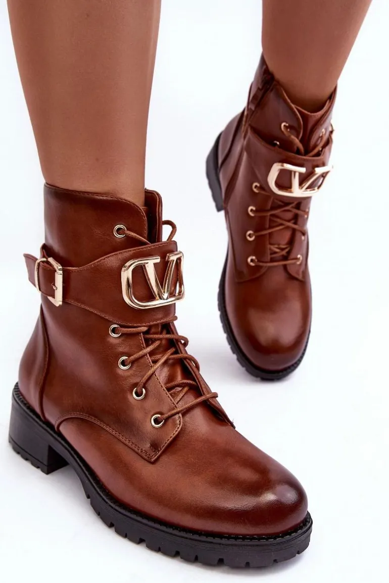 Damskie Ocieplane Botki Workery Złota Klamra Brązowe Vera