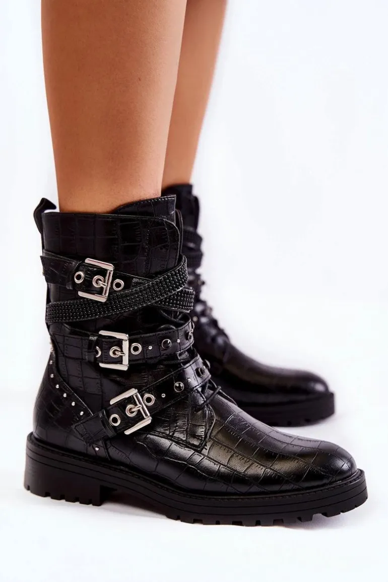 Botki damskie zostały wykonane z eko skóry. Posiadają modne, regulowane paski z ozdobnymi dżetami i koralikami. Osadzone na płaskim obcasie ze żłobieniami. Model ze sznurowaniem oraz suwakiem z boku cholewki. Botki te posiadają ocieplenie w postaci koca obuwniczego. Dodatkowo zapiętek jest usztywniany. Te botki powinny znaleźć się w Twojej szafie! Przy wyborze rozmiaru prosimy sugerować się tabelą rozmiarów.