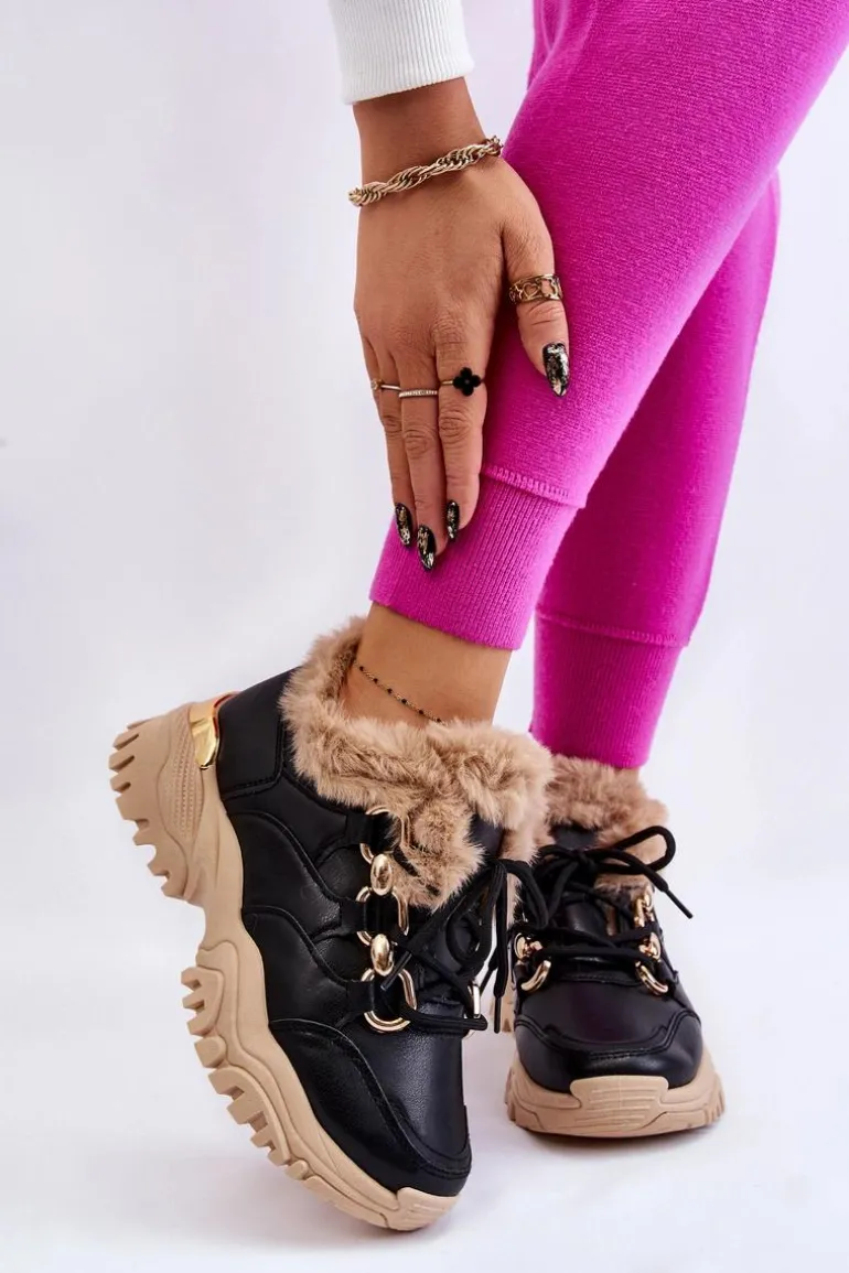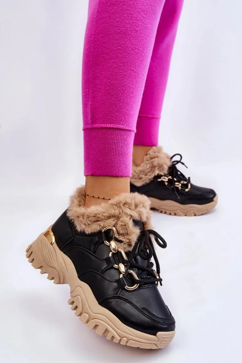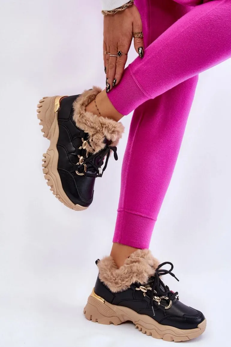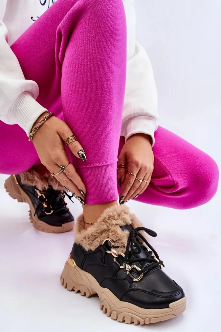 Damskie Ocieplane Buty Sportowe Sznurowane Czarno Beżowe Kerberos