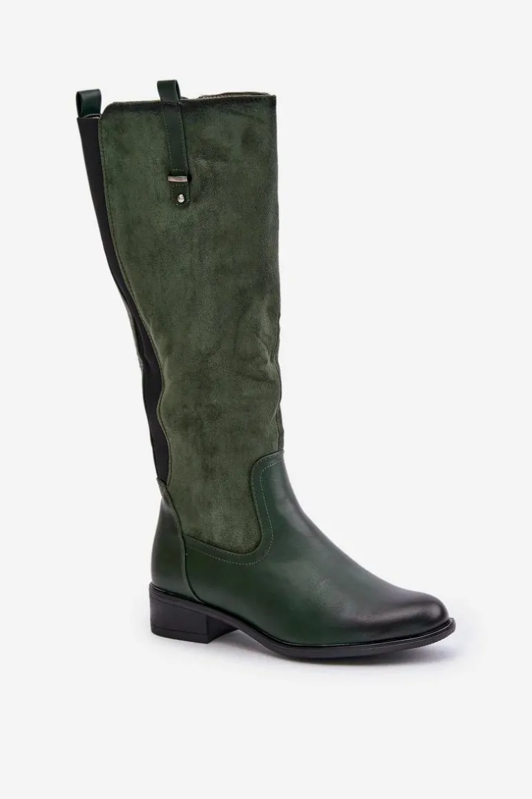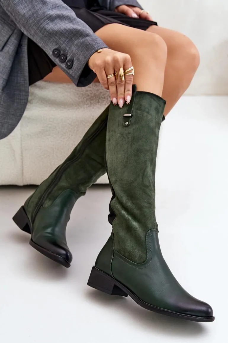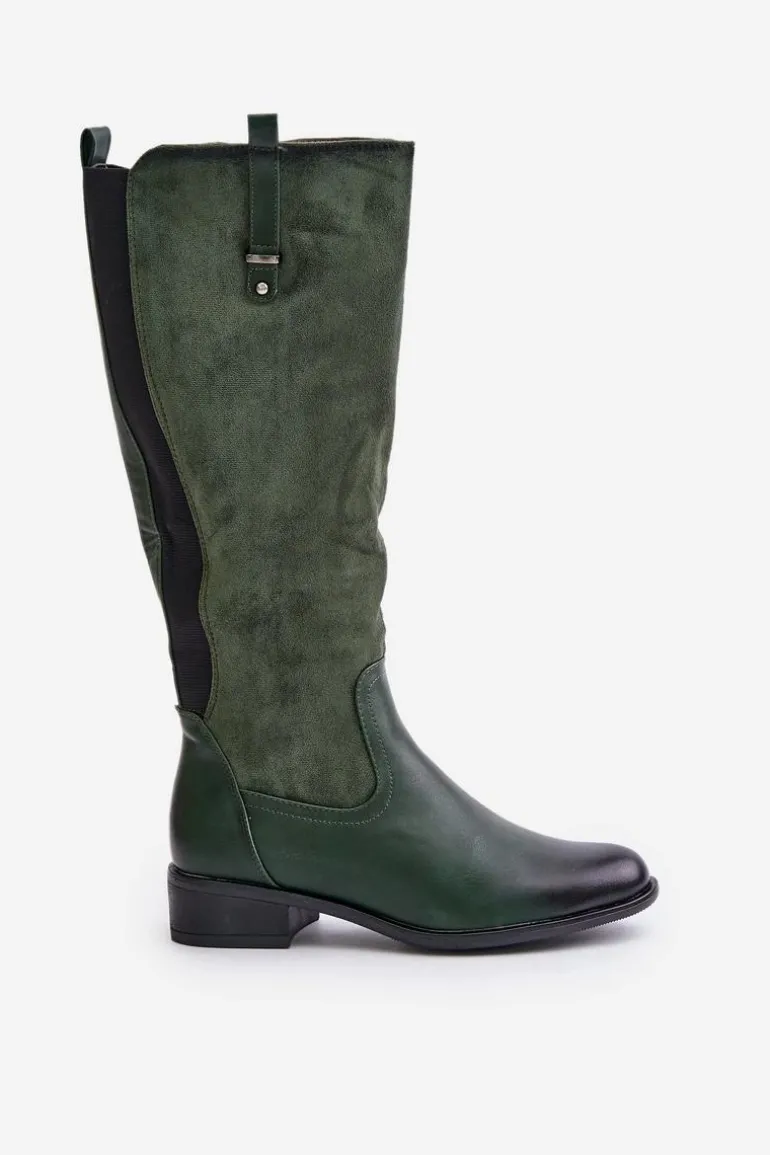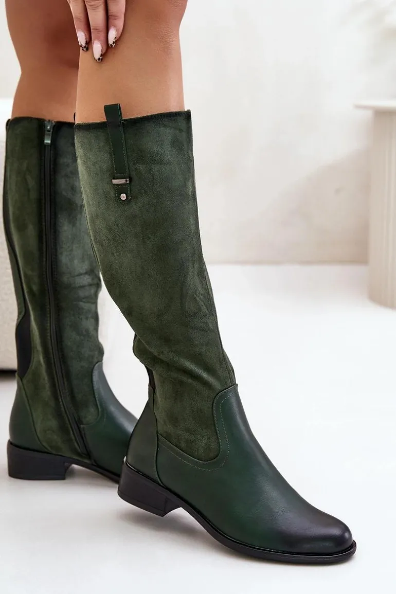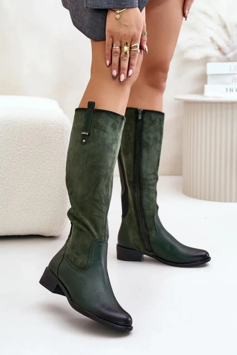 Damskie kozaki marki Jezzi. Cholewka przed kolano. Osadzone na płaskim obcasie, co zapewnia wygodę noszenia przez cały dzień. Posiadają zaokrąglone noski oraz ocieplane wnętrze kocem obuwniczym, co gwarantuje ciepło i komfort. Klasyczny fason sprawia, że będą doskonałym uzupełnieniem każdej stylizacji. Przy wyborze rozmiaru prosimy sugerować się tabelą rozmiarów.