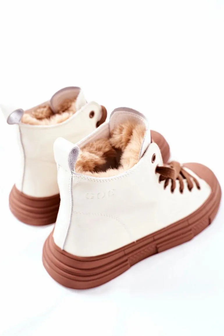 Jeśli szukasz idealnych trampek, to firma GOE ma coś specjalnego! Wysokie trampki, ocieplone wewnątrz kożuszkiem, sięgające aż za kostki. Model klasycznie sznurowany. Buty w całości zostały wykonane z naturalnej skóry licowej. Góra cholewki delikatnie docieplona grubym, sztucznym futerkiem. Dodatkowym atutem jest solidna, antypoślizgowa podeszwa. Przy wyborze rozmiaru prosimy sugerować się tabelą rozmiarów.