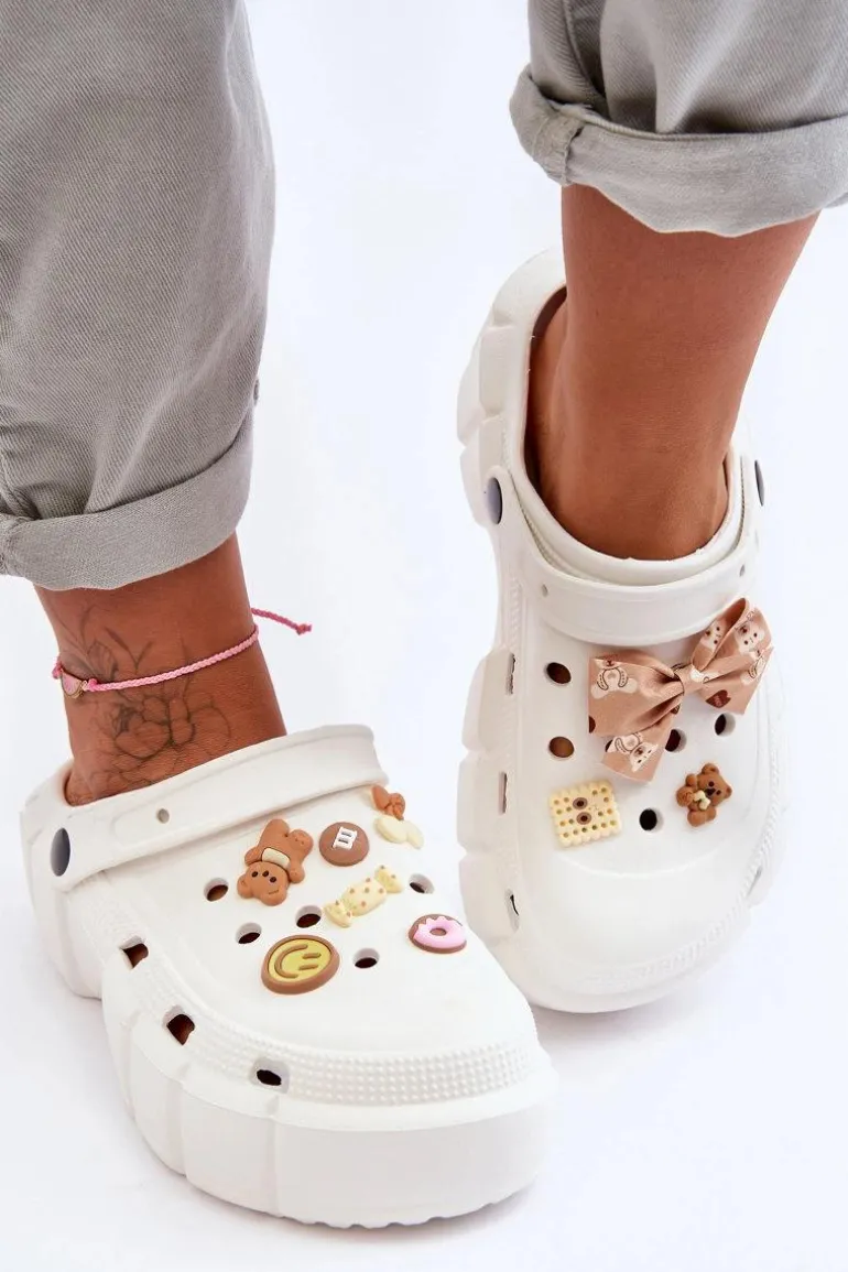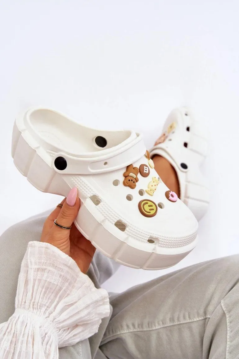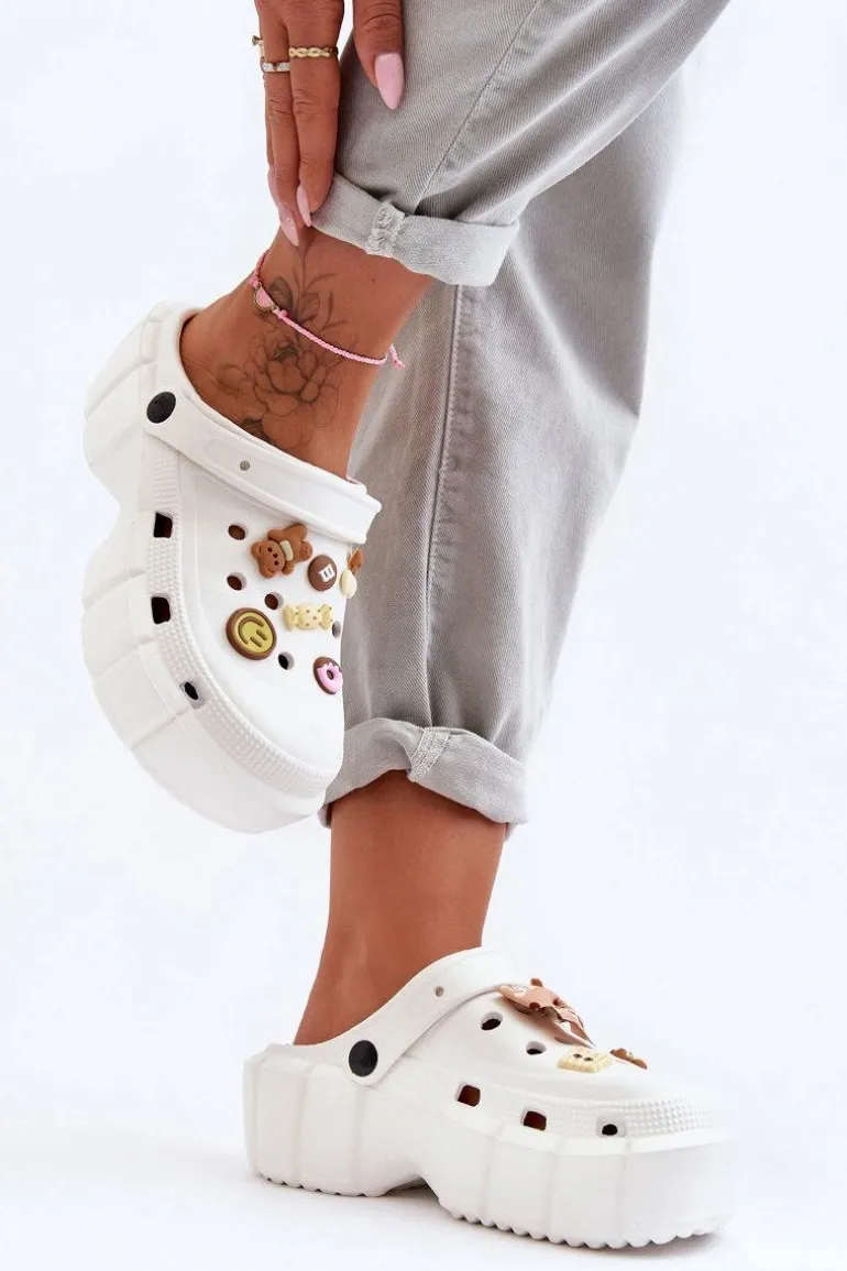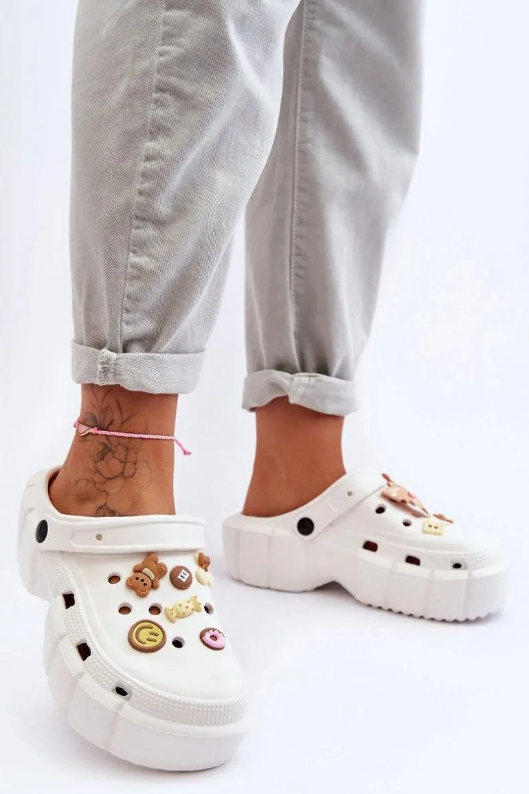 Damskie kroksy z uroczymi elementami zdobiącymi cholewkę powinny być Twoje! Zostały wykonane z lekkiego, piankowego tworzywa. Wkładka posiada delikatne wypustki. Ruchomy paseczek zabezpiecza przed przesuwaniem się stopy. Buty zostały osadzone na masywnym, płaskim obcasie oraz platformie. Otwory w cholewce pozwalają na odpowiednią wentylację obuwia. Przy wyborze rozmiaru prosimy sugerować się tabelą rozmiarów.
