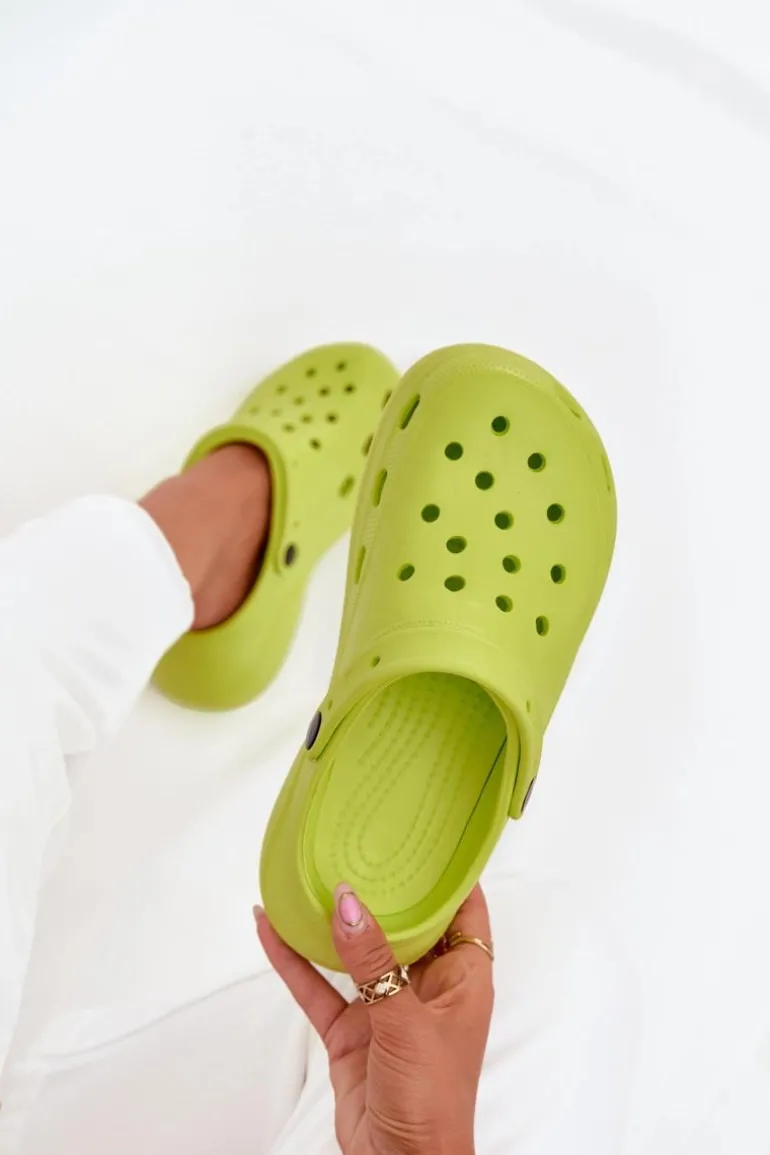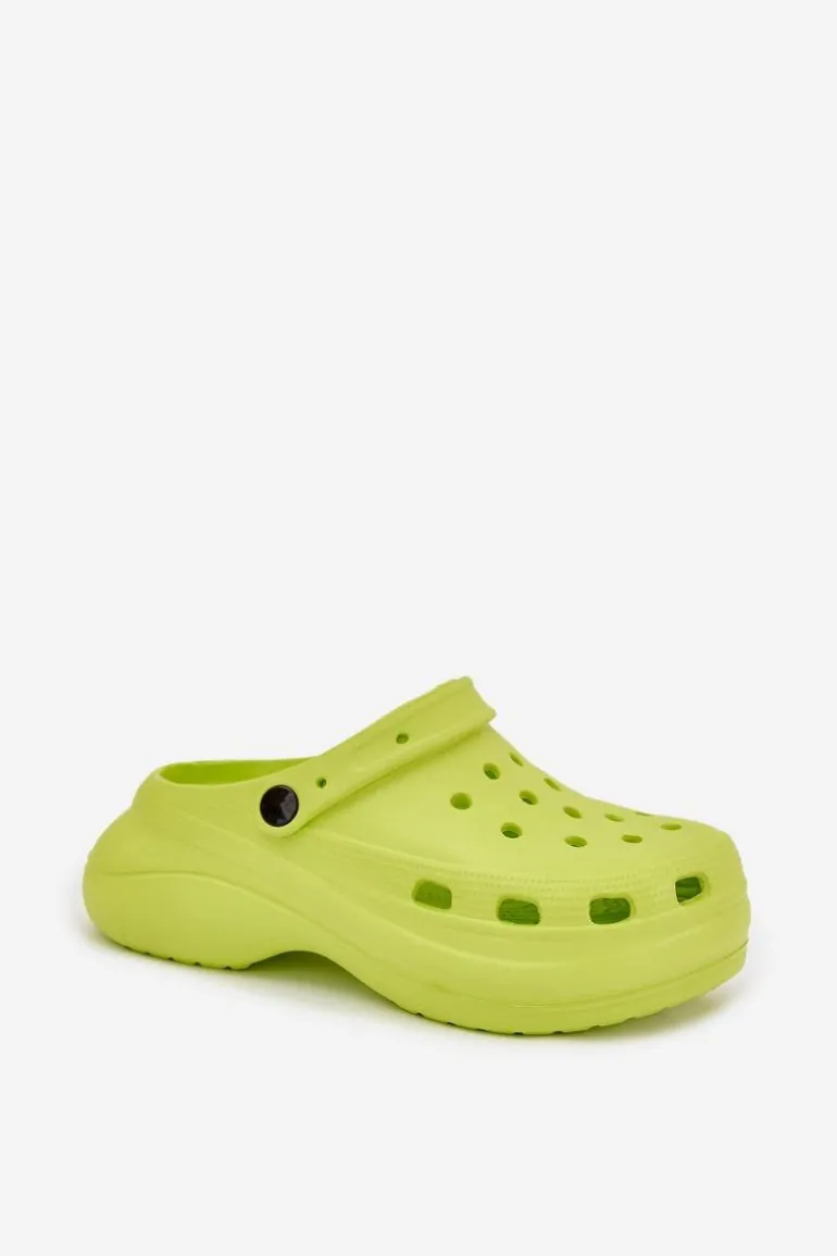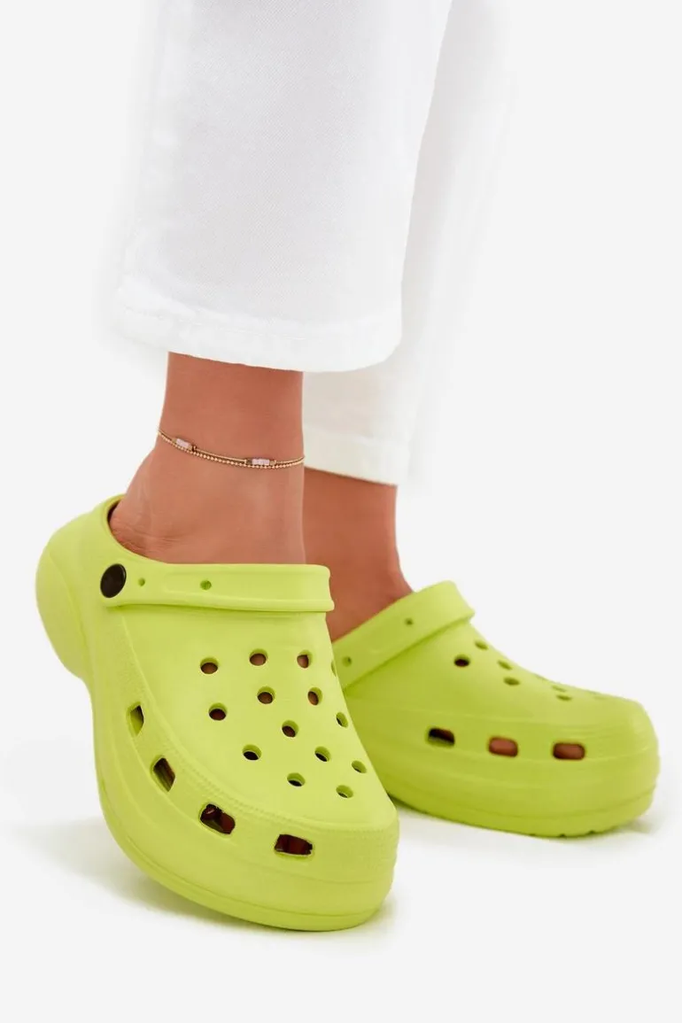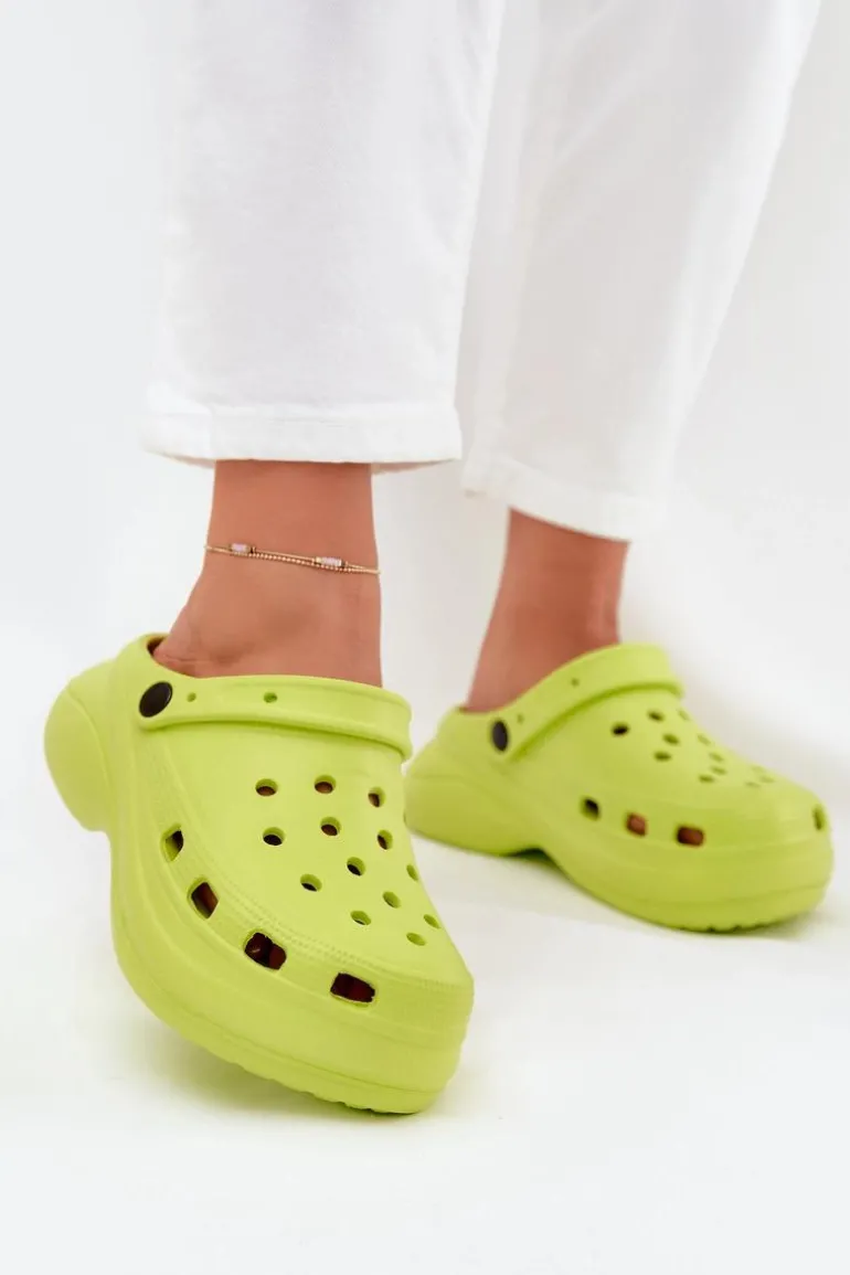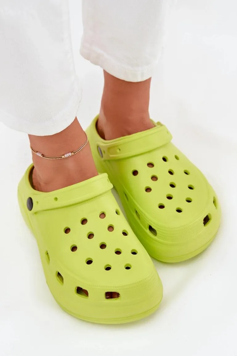 Damskie klapki wykonane z piankowego tworzywa. Wkładka z wypustkami sprawia, że stopy nie będą już takie zmęczone, nawet po całym dniu użytkowania. Ruchomy paseczek zabezpiecza przed przesuwaniem się stopy. Buty zostały osadzone na masywnym obcasie oraz platformie. Idealny model do pracy w ogrodzie czy użytkowania w domu zamiast papci. Otwory w cholewce pozwalają na odpowiednią wentylację obuwia. Przy wyborze rozmiaru prosimy sugerować się tabelą rozmiarów.