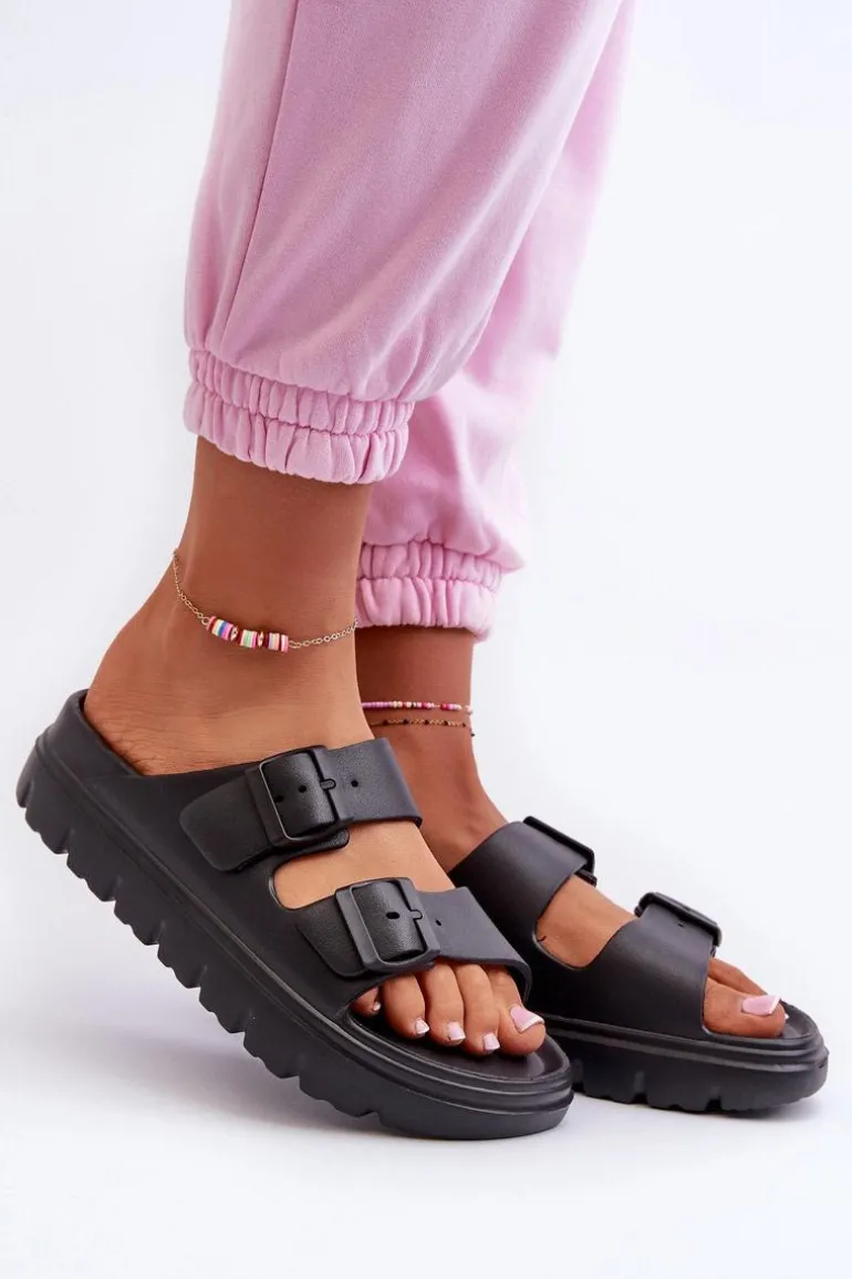 Lekkie i wygodne klapki damskie wykonane z pianki, idealne na lato. Osadzone na platformie, zapewniają komfort noszenia przez cały dzień. Dwa regulowane paski pozwalają na idealne dopasowanie do stopy, te klapki są zarówno praktyczne, jak i stylowe. Przy wyborze rozmiaru prosimy kierować się tabelą rozmiarów.