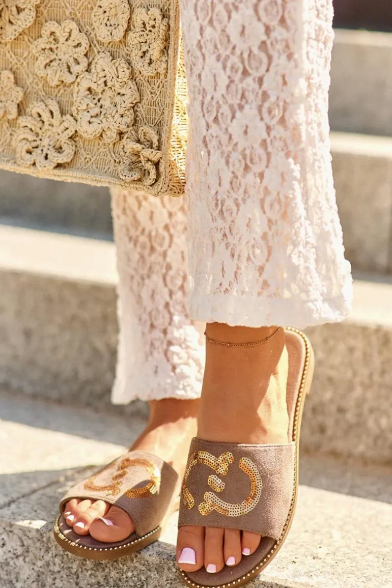 Damskie klapki zostały wykonane z eko zamszu. Osadzone na płaskim obcasie. Ozdobne cekiny na pasku dodają uoku. Miękka wkładka Comfort pozwoli na wygodne użytkowanie obuwia nawet przez cały dzień. Idealne do casualowych stylizacji! Przy wyborze rozmiaru prosimy sugerować się tabelą rozmiarów.