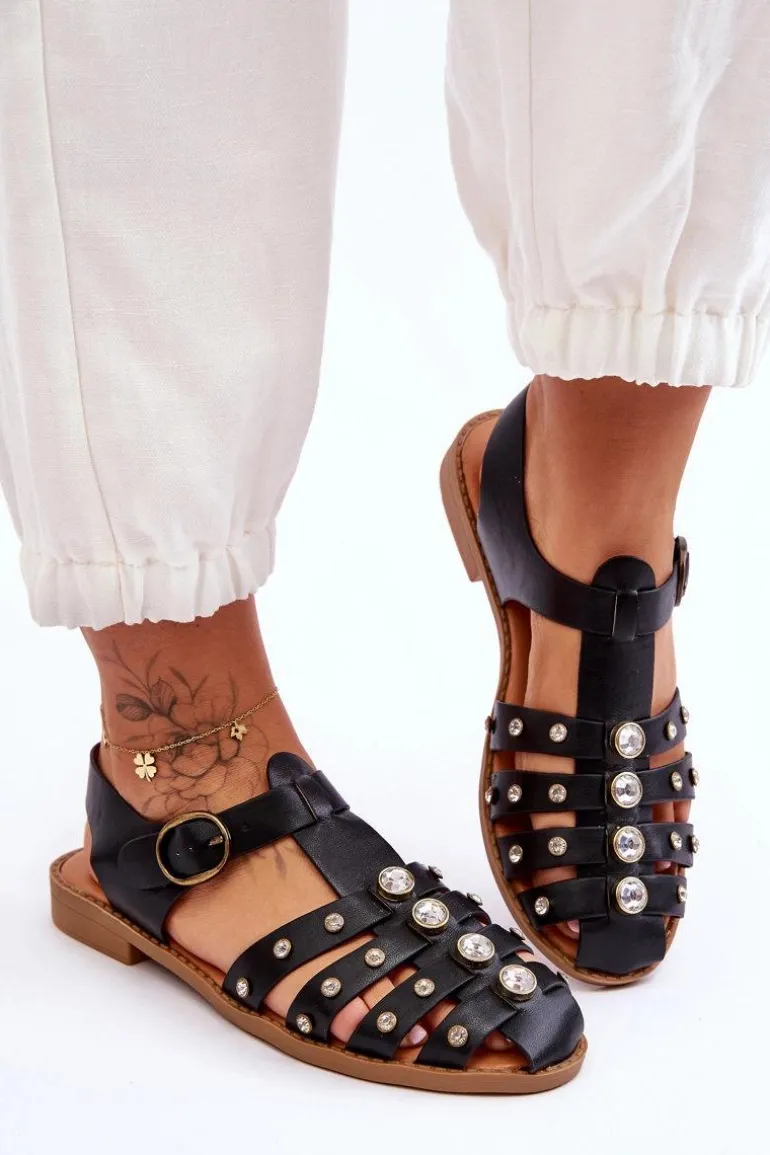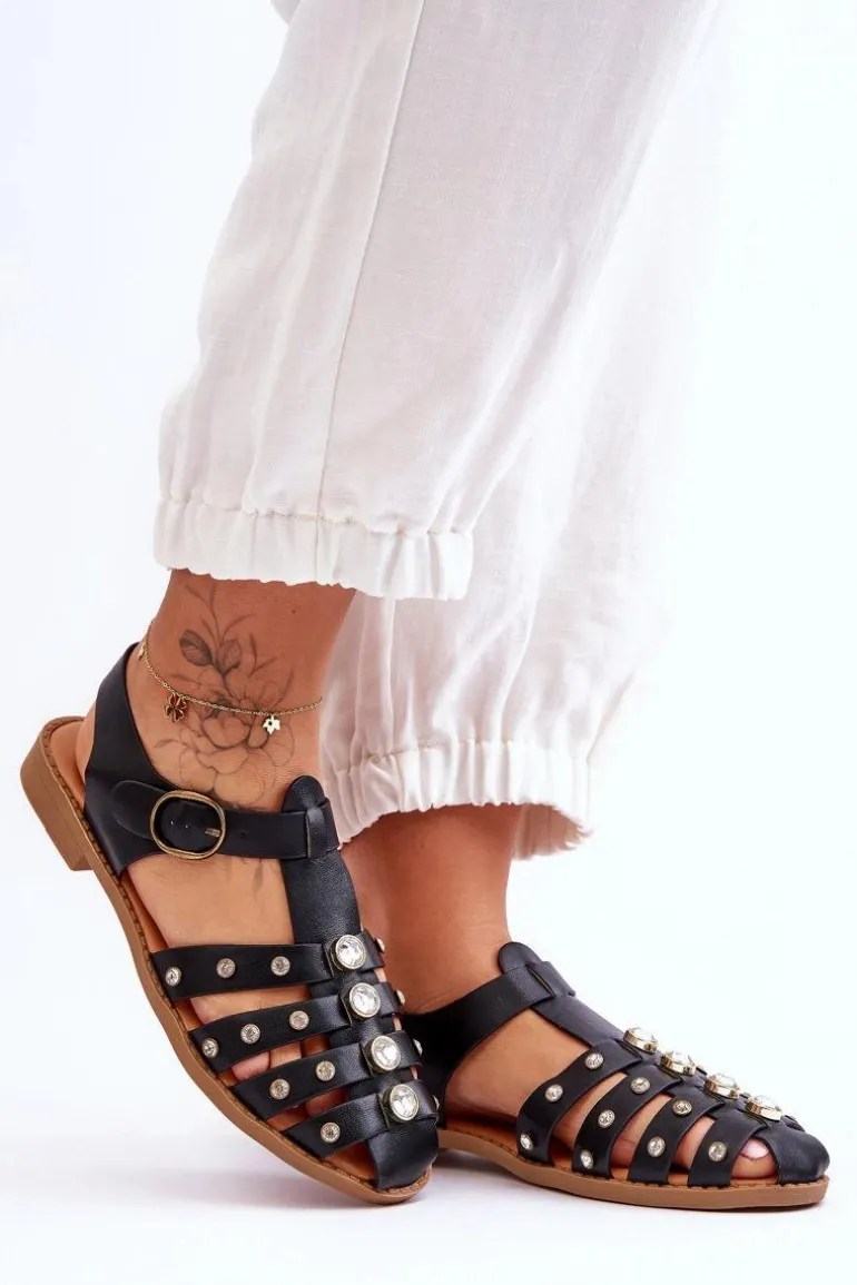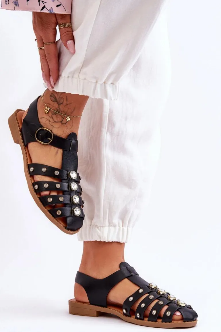 Sandały damskie zostały wykonane z eko skóry. Model ten posiada ozdobne dżety na całości cholewki imitujące cyrkonie. Klasycznie zapinane na regulowany pasek ze sprzączką. Wkładka jest miękka i wygodna podczas użytkowania. Ten niezwykle przewiewny model idealnie sprawdzi się na letnie, upalne dni! Sandałki osadzono na płaskim obcasie z antypoślizgową podeszwą. Przy wyborze rozmiaru prosimy sugerować się tabelą rozmiarów.