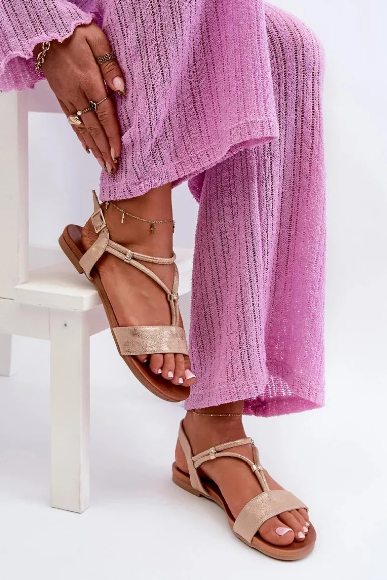 Płaskie sandały damskie wykonane z wysokiej jakości eko skóry. Zapięcie na regulowany pasek ze sprzączką zapewnia idealne dopasowanie i wygodę noszenia. Idealne na ciepłe dni, łączą styl z funkcjonalnością, doskonale sprawdzając się zarówno na codzienne spacery, jak i na bardziej eleganckie okazje. Przy wyborze rozmiaru prosimy kierować się tabelą rozmiarów.