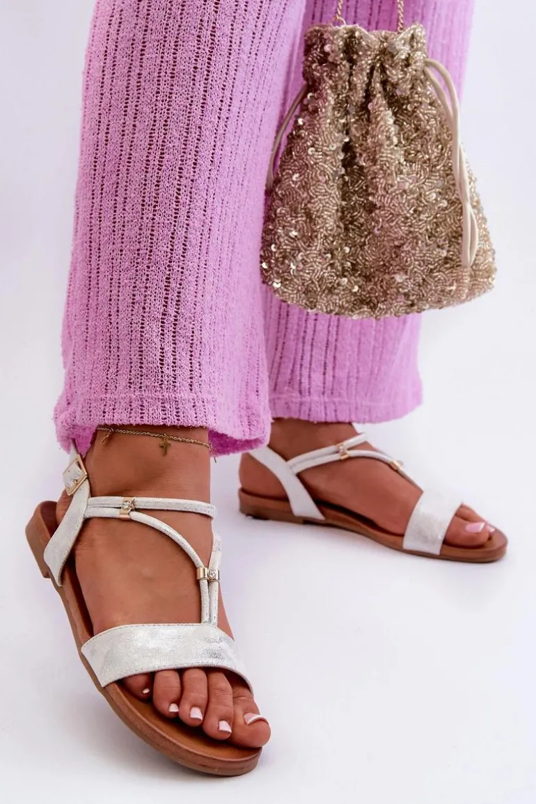 Płaskie sandały damskie wykonane z wysokiej jakości eko skóry. Zapięcie na regulowany pasek ze sprzączką zapewnia idealne dopasowanie i wygodę noszenia. Idealne na ciepłe dni, łączą styl z funkcjonalnością, doskonale sprawdzając się zarówno na codzienne spacery, jak i na bardziej eleganckie okazje. Przy wyborze rozmiaru prosimy kierować się tabelą rozmiarów.