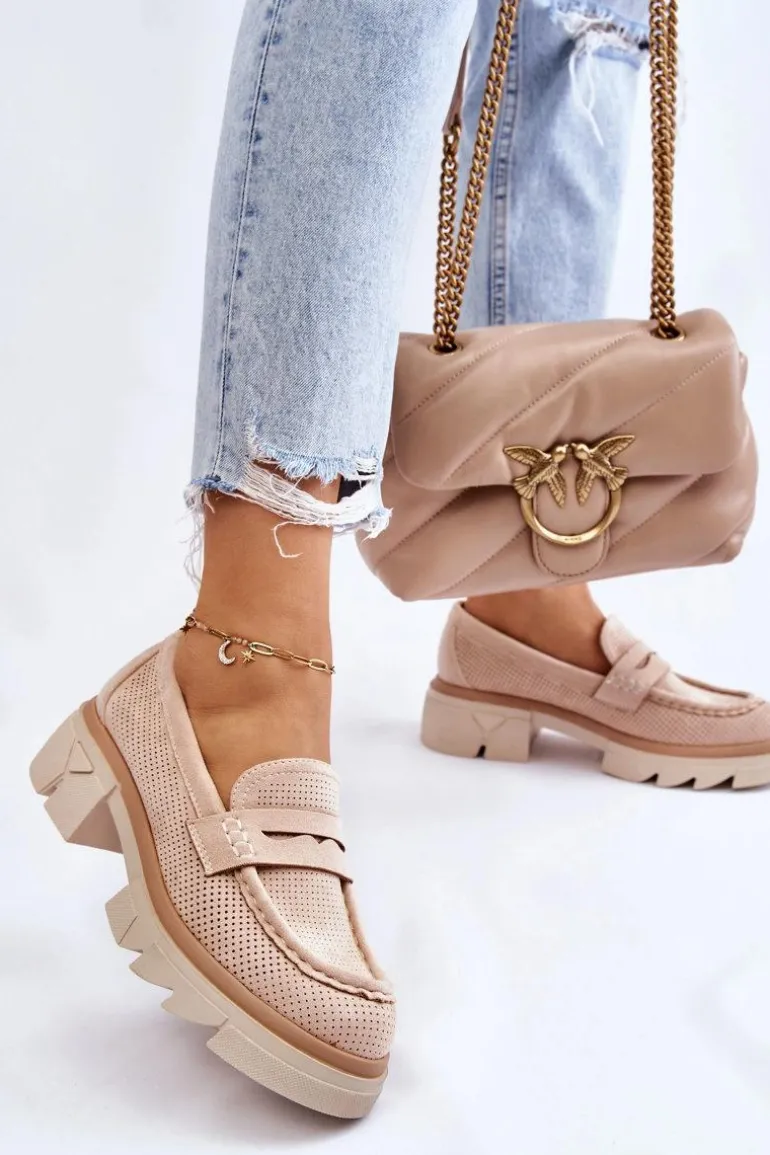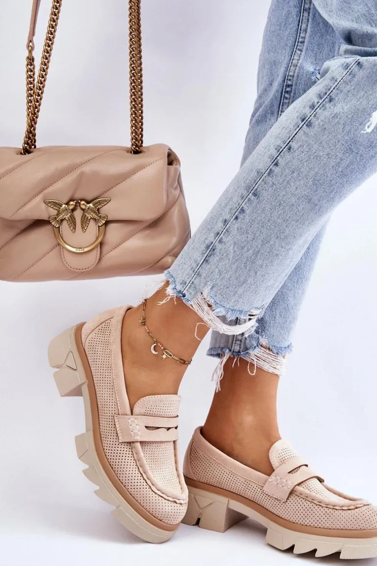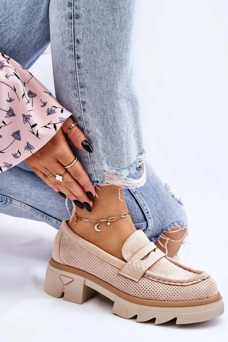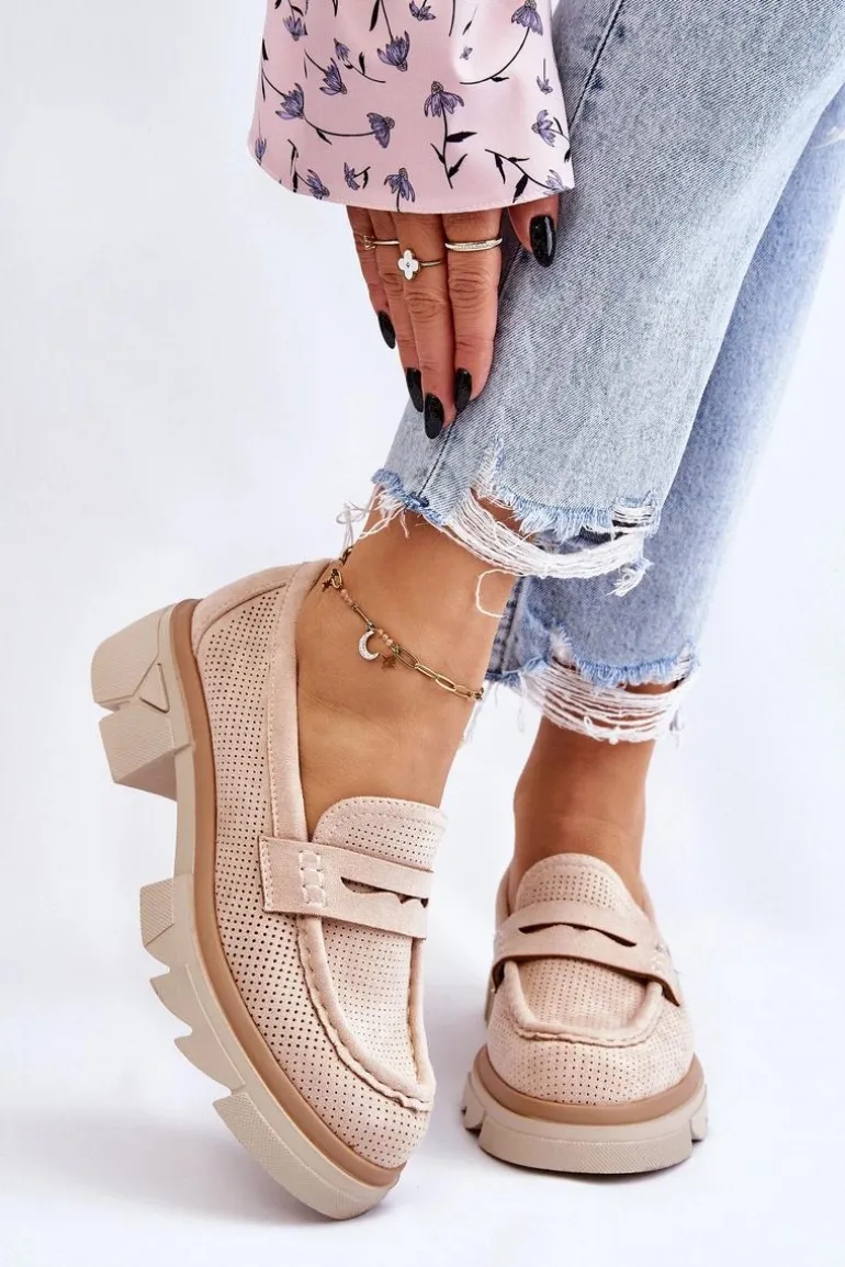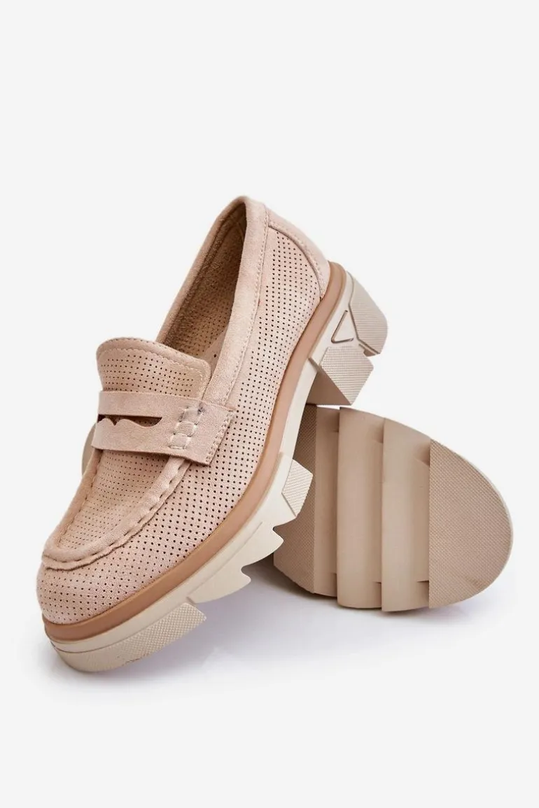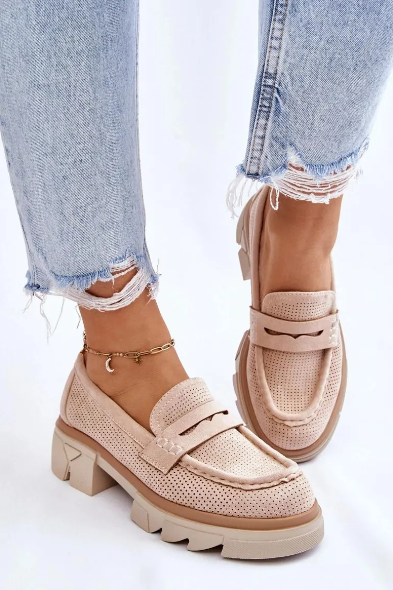Damskie półbuty w stylu mokasynów zostały osadzone na masywnym, płaskim obcasie i platformie. Wykonane z materiału przypominającego eko zamsz. Miękka wkładka z naturalnej skóry zapewni wygodę podczas użytkowania. Cholewka w ażurowy wzór. Zapiętek został usztywniony. Świetny model do wielu stylizacji! Przy wyborze rozmiaru prosimy sugerować się tabelą rozmiarów.