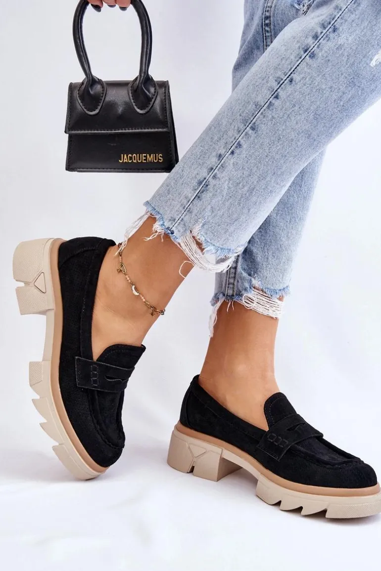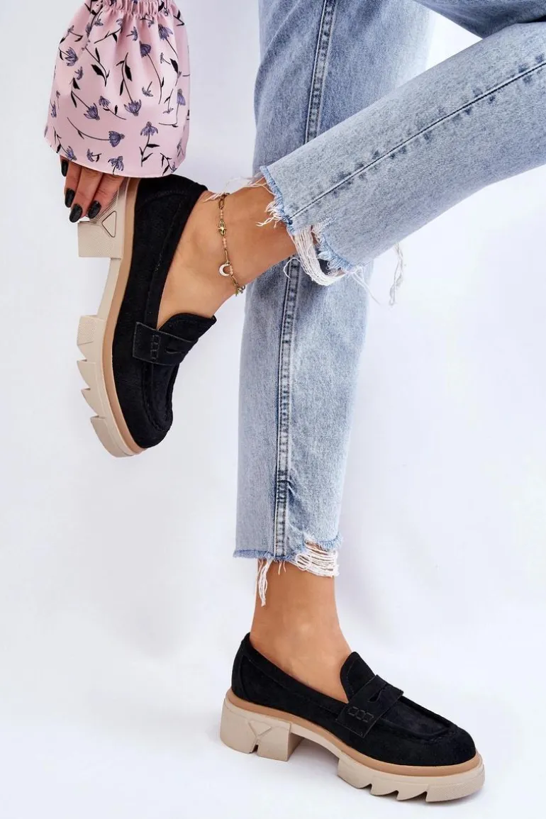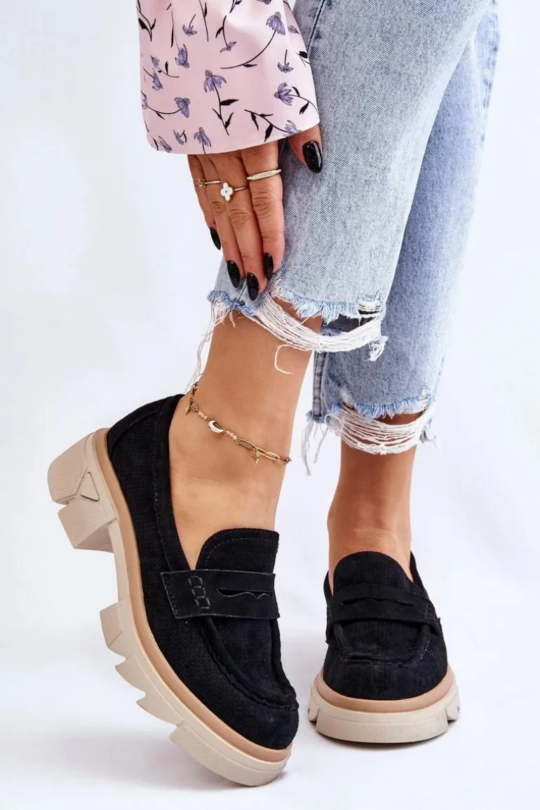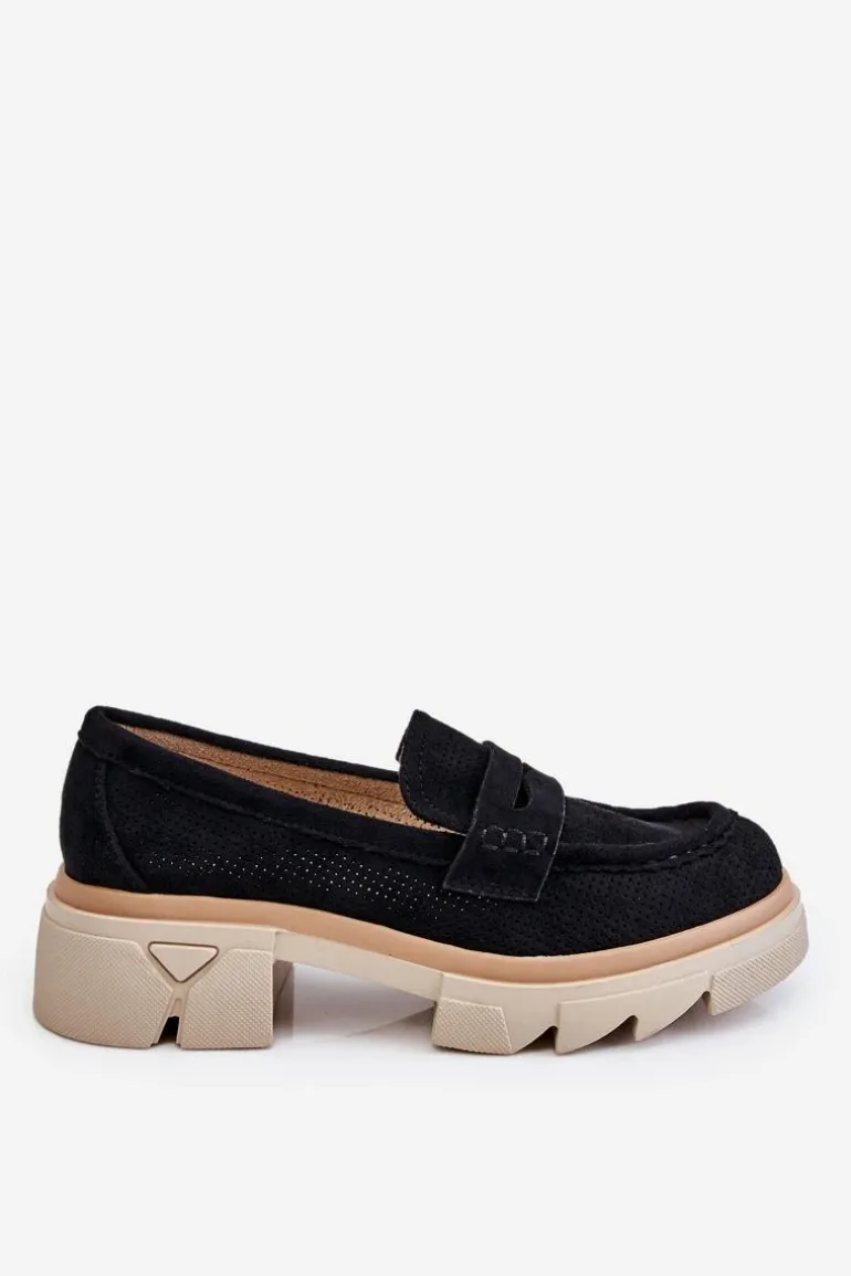 Damskie półbuty w stylu mokasynów zostały osadzone na masywnym, płaskim obcasie i platformie. Wykonane z materiału przypominającego eko zamsz. Miękka wkładka z naturalnej skóry zapewni wygodę podczas użytkowania. Cholewka w ażurowy wzór. Zapiętek został usztywniony. Świetny model do wielu stylizacji! Przy wyborze rozmiaru prosimy sugerować się tabelą rozmiarów.