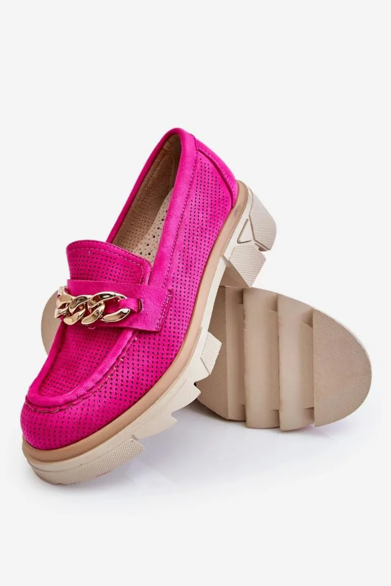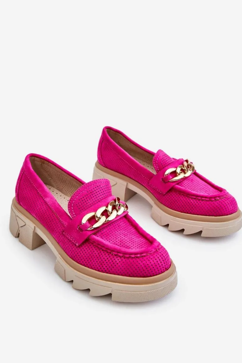 Damskie półbuty w stylu mokasynów zostały osadzone na masywnym, płaskim obcasie i platformie. Ozdobione eleganckim łańcuchem z przodu buta. Wykonane z materiału przypominającego eko zamsz. Miękka wkładka z naturalnej skóry zapewni wygodę podczas użytkowania. Cholewka w ażurowy wzór. Idealny model do wielu stylizacji! Przy wyborze rozmiaru prosimy sugerować się tabelą rozmiarów.