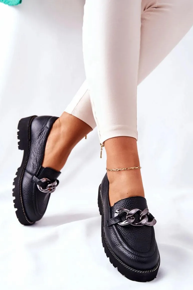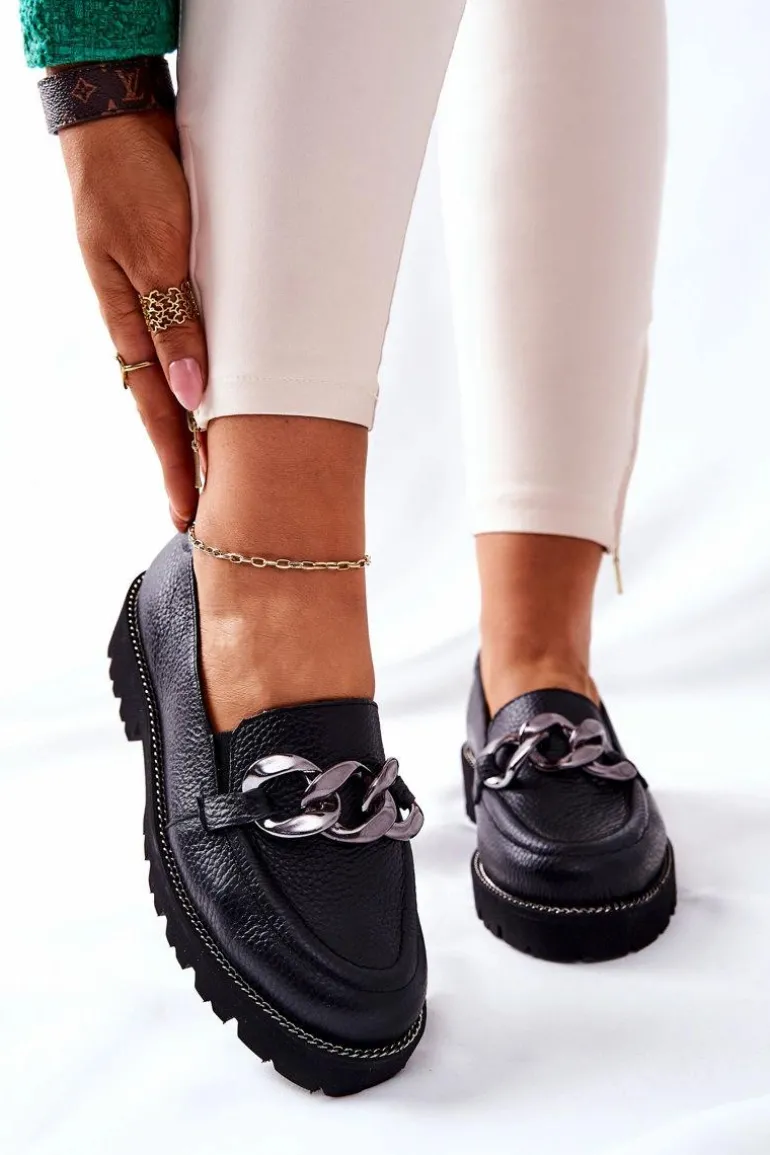 Klasyczne półbuty w stylu przepięknych loaferów! Buty zostały wykonane z wysokiej jakości skóry naturalnej. Charakterystyczne zdobienie w postaci łańcucha sprawi, że stworzymy z nimi wiele wspaniałych stylizacji. Wysoka podeszwa oraz obcas, który uniesie naszą sylwetkę. Przy wyborze rozmiaru prosimy sugerować się tabelą rozmiarów.
