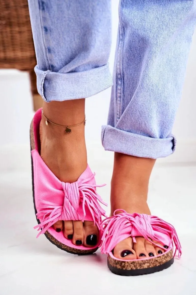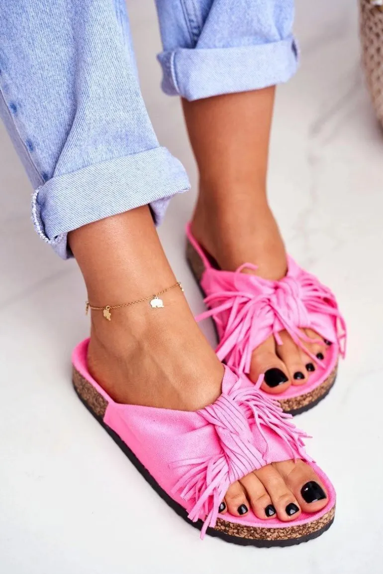 Damskie Różowe Fluo Klapki Na Korku Frędzle Marina