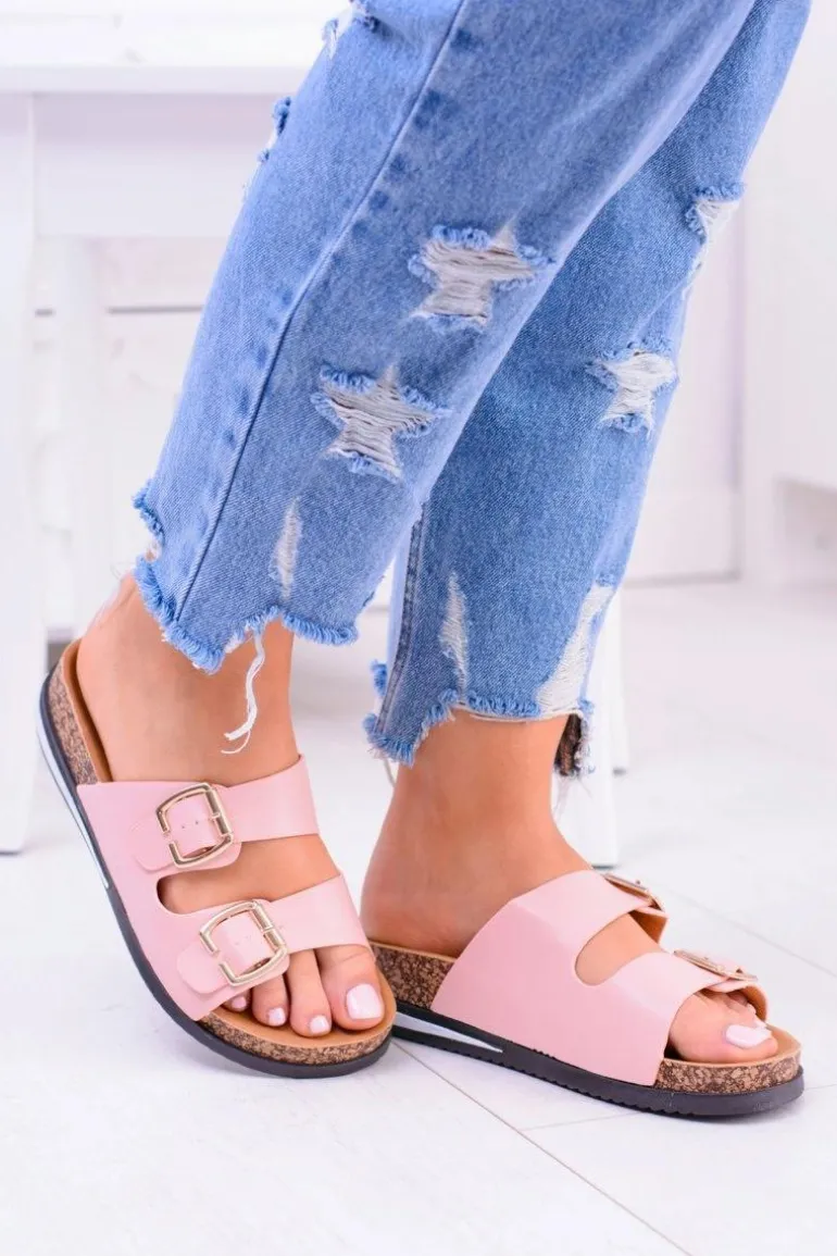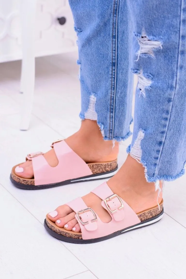 Damskie Różowe Klapki Z Klamrami Na Korku Ferone