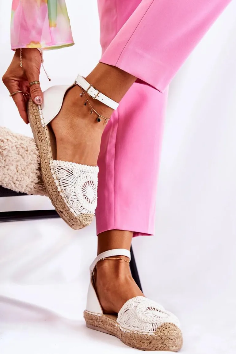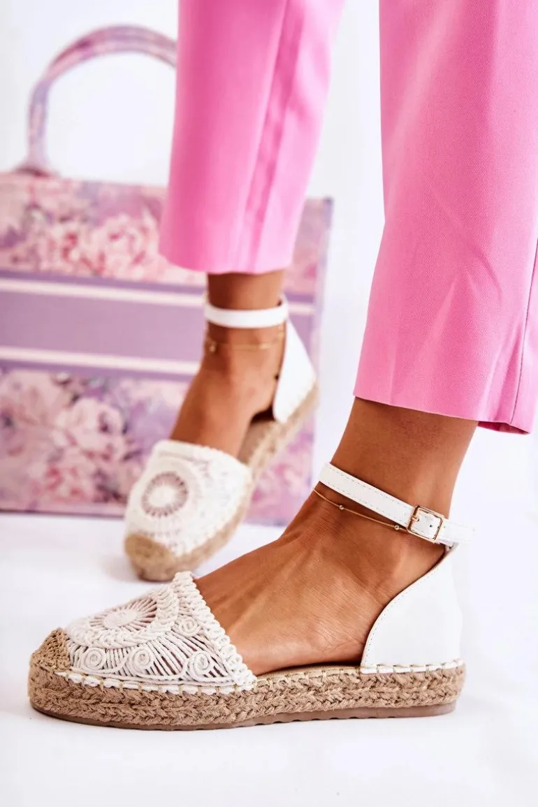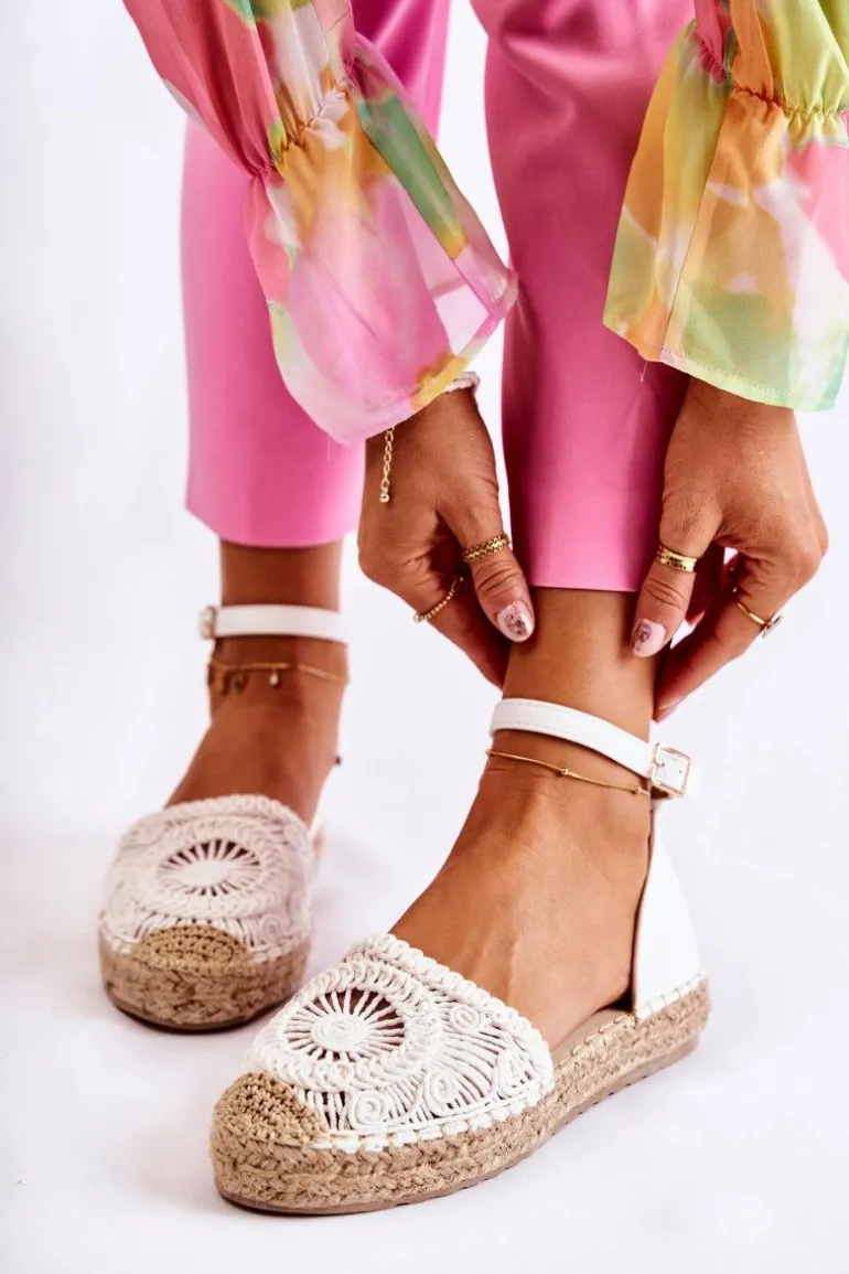 Klasyczne sandały w formie espadryli. Wykonane z ażurowej tkaniny oraz eko skóry. Espadryle posiadają platformę zdobioną warkoczem z juty. Platforma została wykonana natomiast z tworzywa sztucznego. Sandały są zapinane wokół kostki na sprzączkę z regulowanym paskiem. Wkładka wykonana z tkaniny. Model, który na pewno pokochasz! Przy wyborze rozmiaru prosimy sugerować się tabelą rozmiarów.