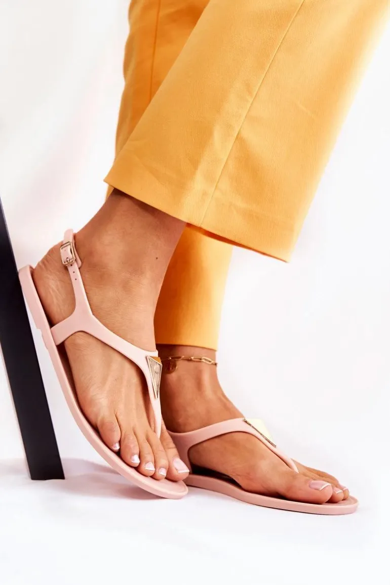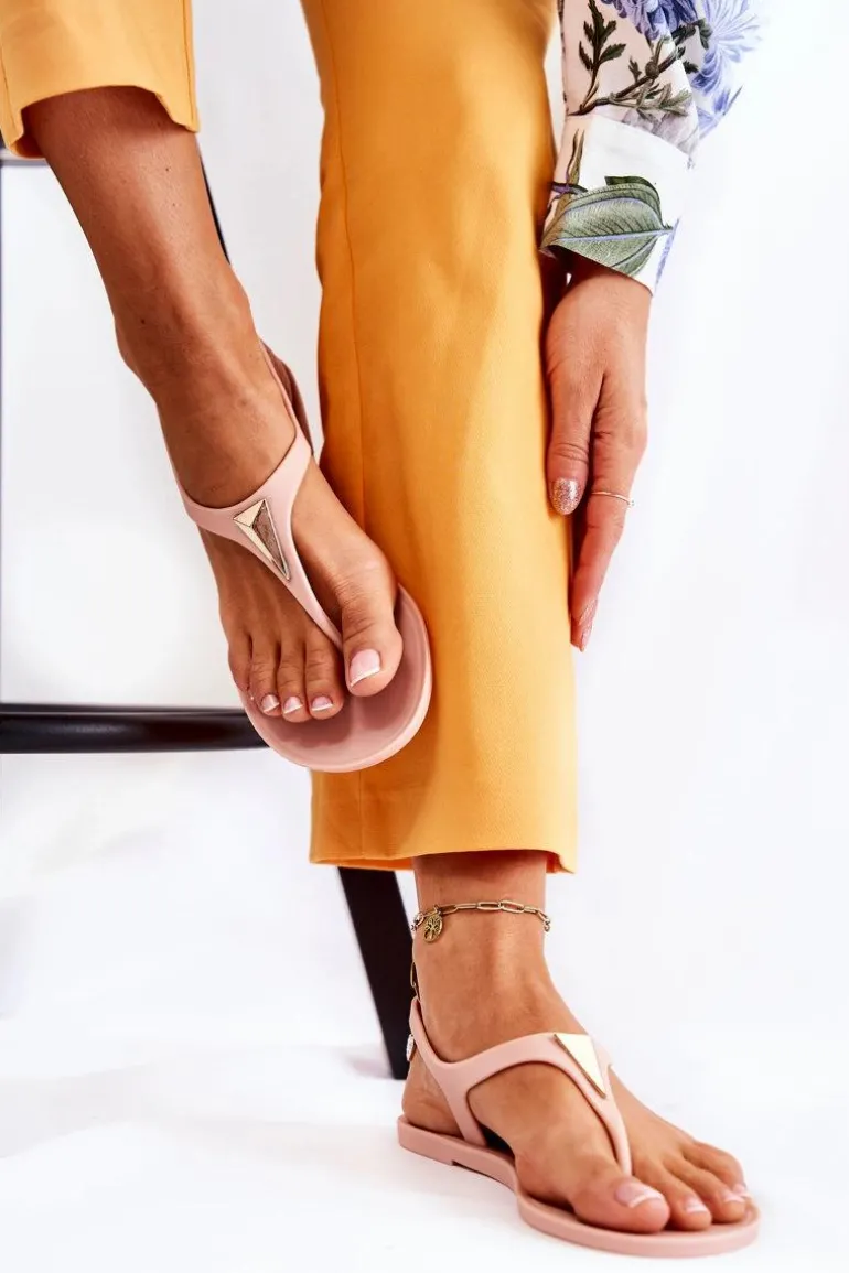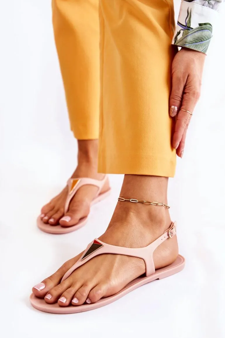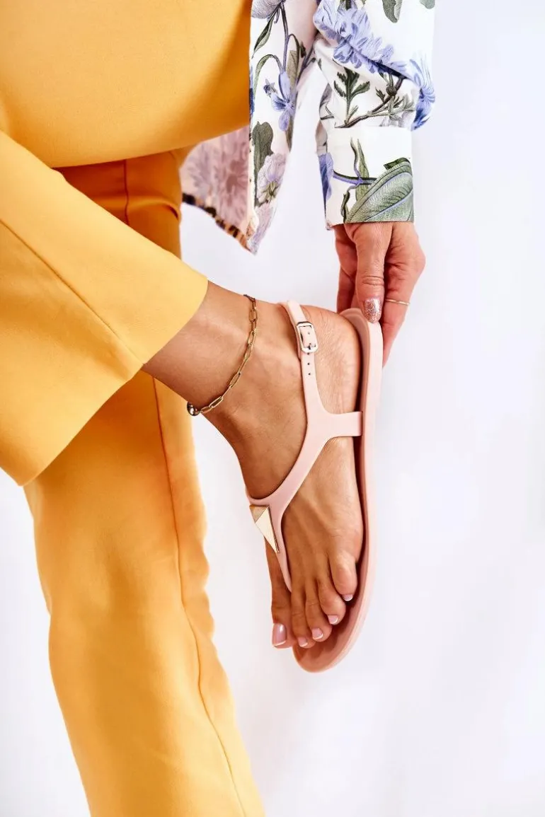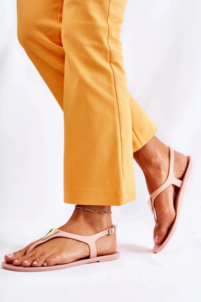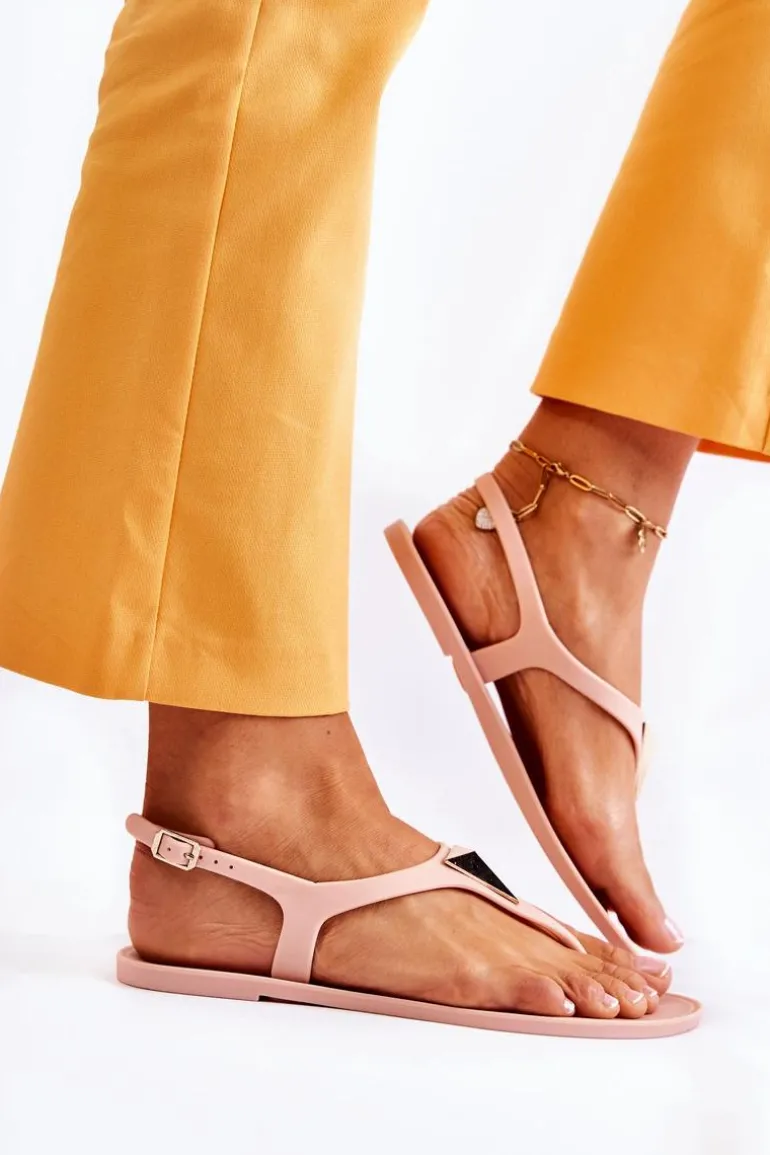 Modne sandałki – japonki damskie zostały wykonane z gumowego tworzywa. Posiadają niski, płaski obcas. Zapinane wokół kostki na regulowany pasek ze sprzączką. Na środku znajduje się emblemat w kształcie trójkąta. Niezwykle przewiewne obuwie, które świetnie sprawdzi się podczas upalnych dni. Koniecznie powinnaś mieć ten model w swojej szafie! Przy wyborze rozmiaru, prosimy sugerować się tabelą rozmiarów.