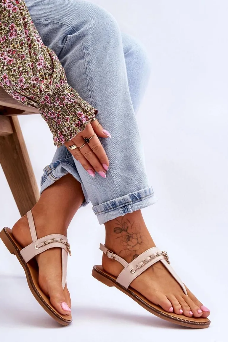 Sandały o fasonie japonek to idealny wybór na cieplejsze dni! Zostały wykonane z eko skóry. Posiadają zdobienie w postaci łańcuszka oraz kłódki. Zapinane wokół kostki na regulowany pasek ze sprzączką. Dodatkowo na podeszwie przy wkładce znajdują się zdobienia. Sandałki osadzono na płaskim obcasie i gumowej podeszwie. Komfortowa w użytkowaniu wkładka została wykonana z eko skóry. Przy wyborze rozmiaru prosimy kierować się tabelą rozmiarów.