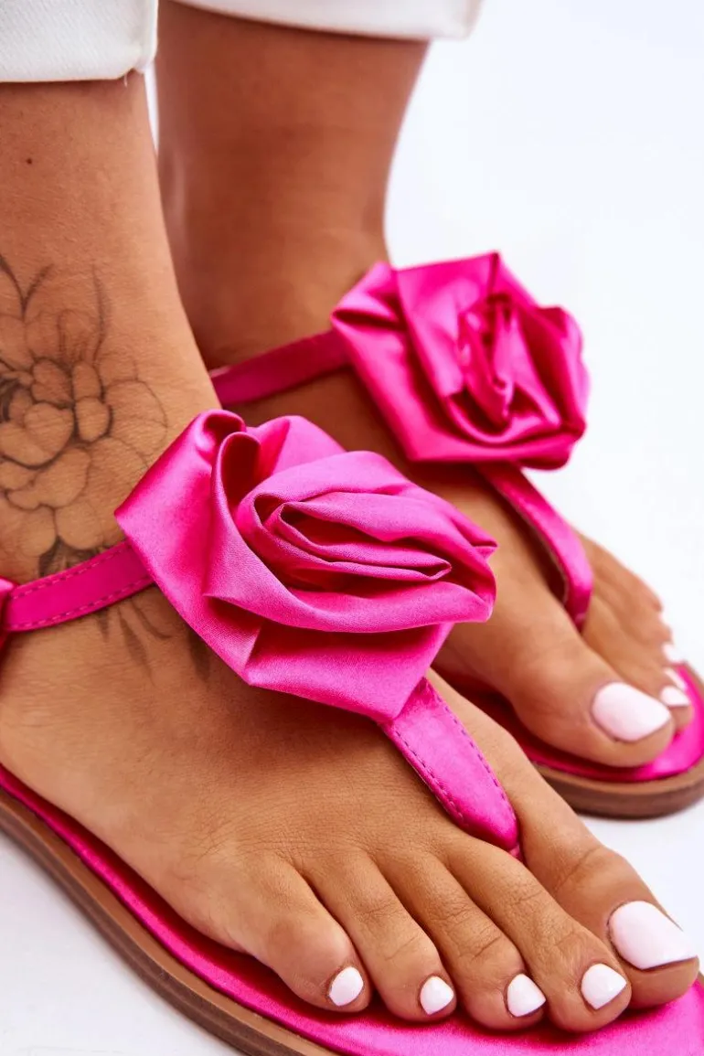 Damskie sandałki zostały wykonane z materiału tekstylnego imitującego satynę. Ozdobione na środku dużą, materiałową różą. Sandałki w stylu japonek osadzono na płaskim obcasie. Zapinane są na regulowany pasek ze sprzączką. Miękka wkładka została wykonana z materiału. Przy wyborze rozmiaru prosimy kierować się tabelą rozmiarów.