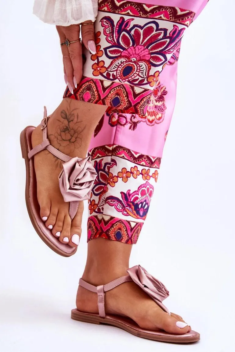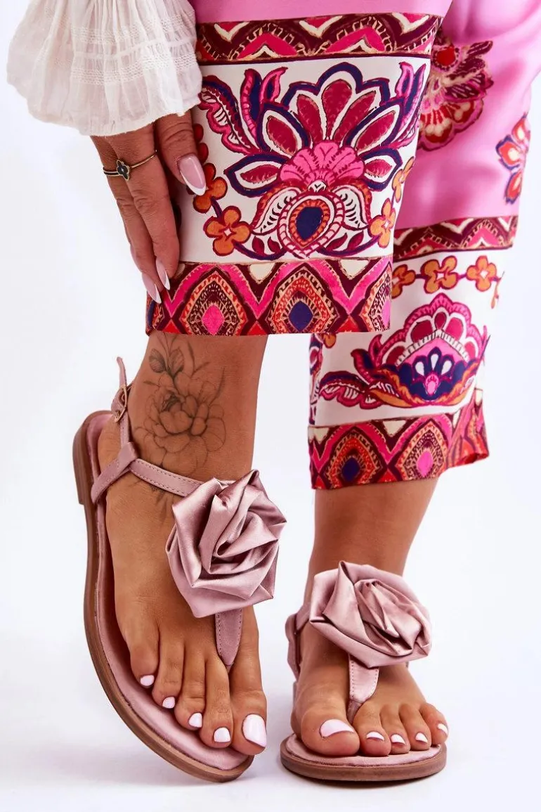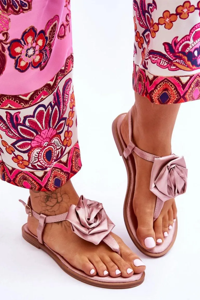 Damskie sandałki zostały wykonane z materiału tekstylnego imitującego satynę. Ozdobione na środku dużą, materiałową różą. Sandałki w stylu japonek osadzono na płaskim obcasie. Zapinane są na regulowany pasek ze sprzączką. Miękka wkładka została wykonana z materiału. Przy wyborze rozmiaru prosimy kierować się tabelą rozmiarów.