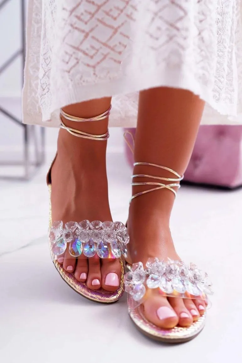 Sandały to nieodłączny element kobiecych letnich stylizacji. Można je założyć dosłownie do wszystkiego! Ten model wyróżnia się kryształowymi zdobieniami oraz efektownym wiązaniem wokół kostki. Przy wyborze rozmiaru prosimy sugerować się tabelą rozmiarów, która dostępna jest po najechaniu bądź kliknięciu w dany rozmiar.