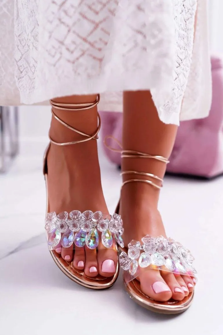 Sandały to nieodłączny element kobiecych letnich stylizacji. Można je założyć dosłownie do wszystkiego! Ten model wyróżnia się kryształowymi zdobieniami oraz efektownym wiązaniem wokół kostki. Przy wyborze rozmiaru prosimy sugerować się tabelą rozmiarów, która dostępna jest po najechaniu bądź kliknięciu w dany rozmiar.