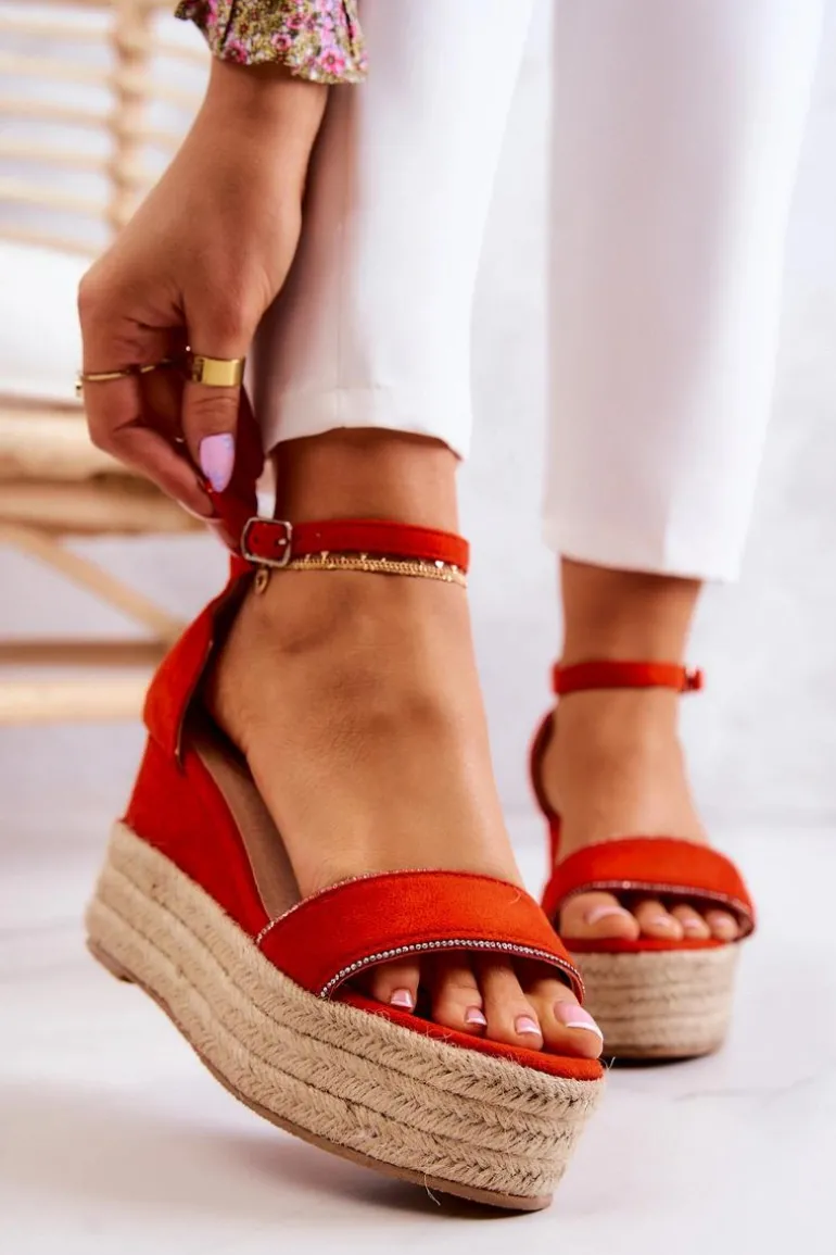 Sandały na koturnie zostały wykonane z eko zamszu. Posiadają paseczek z ozdobą imitującą cyrkonie. Stabilny koturn oraz platforma zdobiona jutowym warkoczem. Zapinane wokół kostki na sprzączkę z regulowanym paskiem. Eko skórzana wkładka zapewni komfort przez cały dzień. Podeszwa wykonana z gumowego tworzywa, która jest antypoślizgowa. Uzupełnij swoje stylizacje o te wspaniałe sandały. Przy wyborze rozmiaru prosimy sugerować się tabelą rozmiarów.
