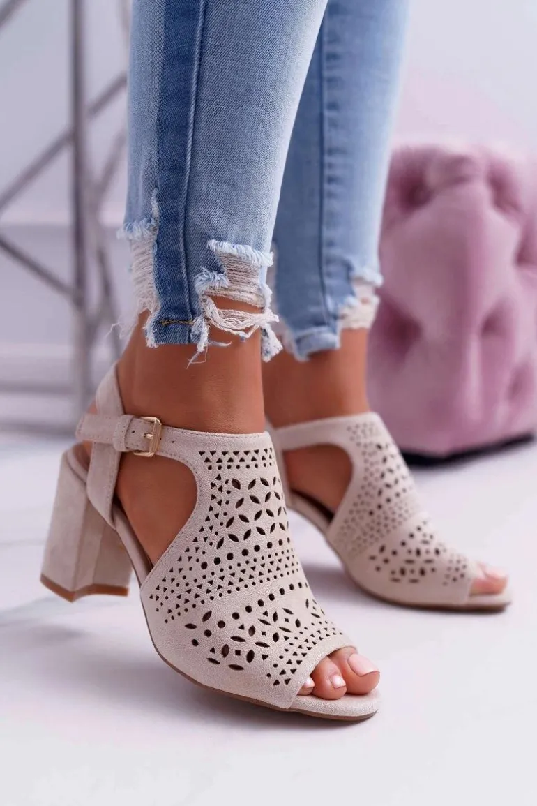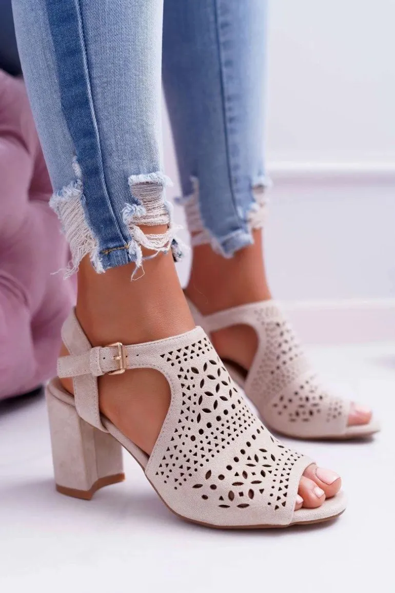 Modne sandały damskie wykonane z eko-zamszu. Ażurowe wykończenie, nosek w tylu peep toe oraz stabilny słupek. Te buty mają wszystko o czym zawsze marzyłyśmy. Idealne dopasowanie dzięki wszytej gumce. Przy wyborze rozmiaru prosimy sugerować się tabelą rozmiarów, która dostępna jest po najechaniu bądź kliknięciu w dany rozmiar.