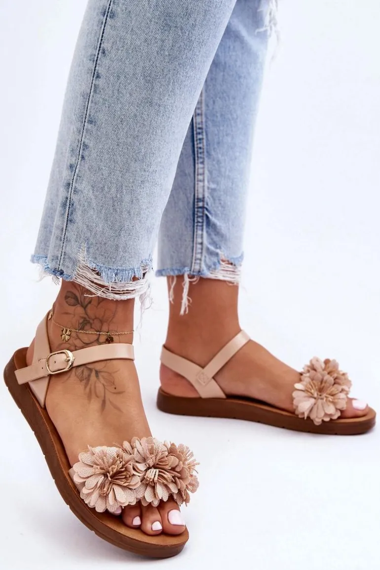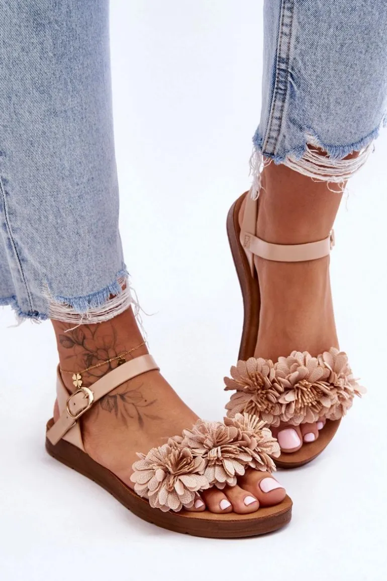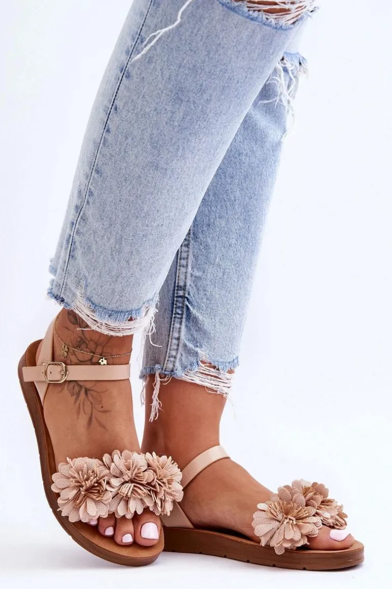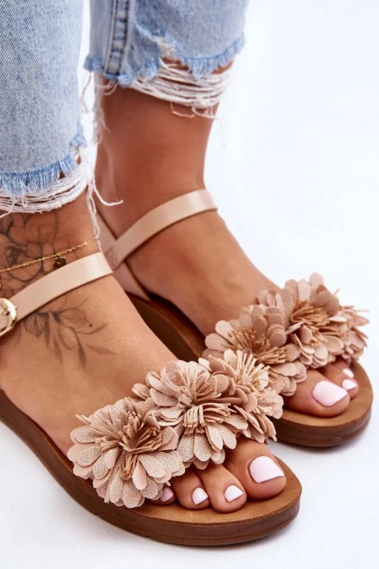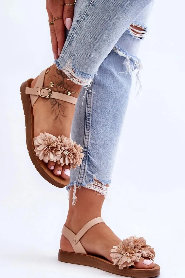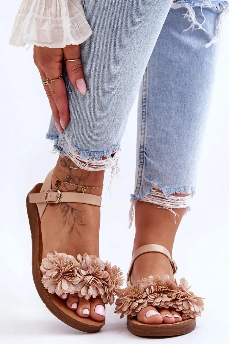 Damskie Sandały Z Materiałowymi Kwiatami Beżowe Fiori
