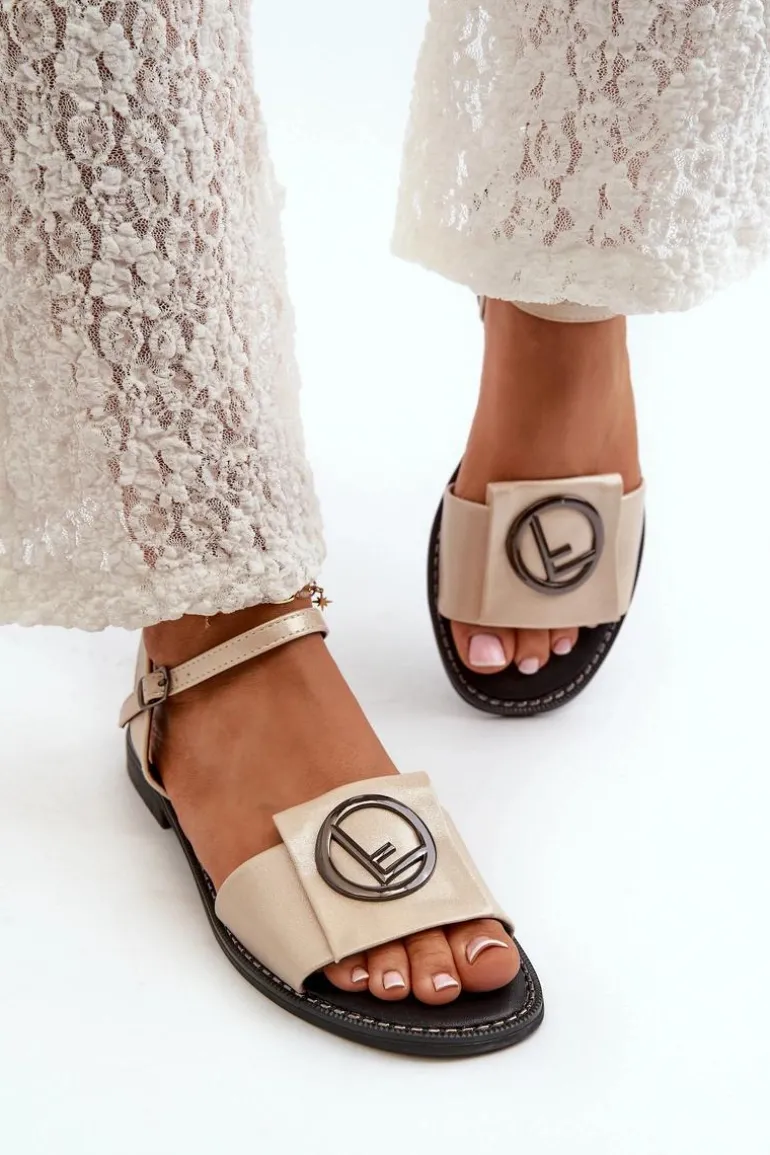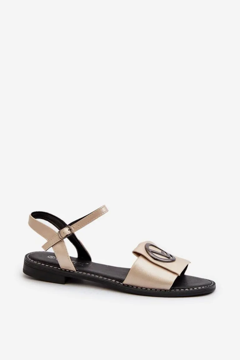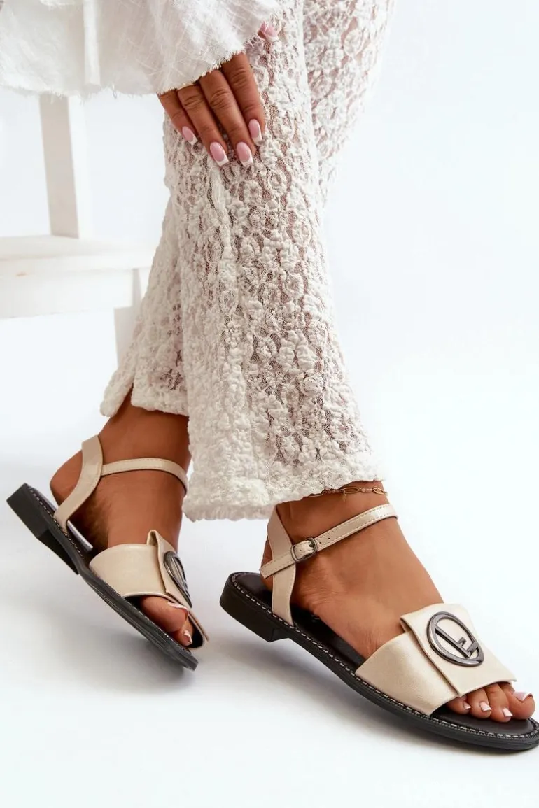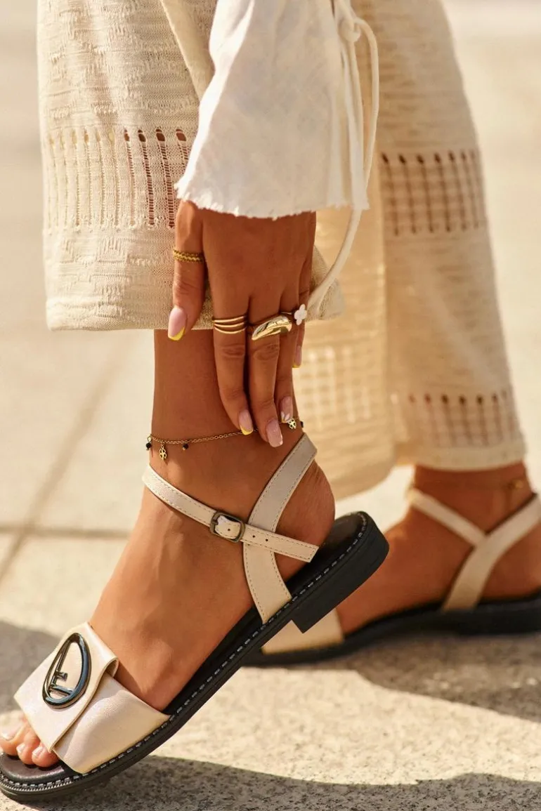 Eleganckie, płaskie sandały damskie z ozdobnymi detalami. Zapinane na regulowany pasek ze sprzączką, zapewniają idealne dopasowanie. Stylowy design i wygoda sprawiają, że są doskonałym wyborem na różne okazje. Przy wyborze rozmiaru prosimy kierować się tabelą rozmiarów.