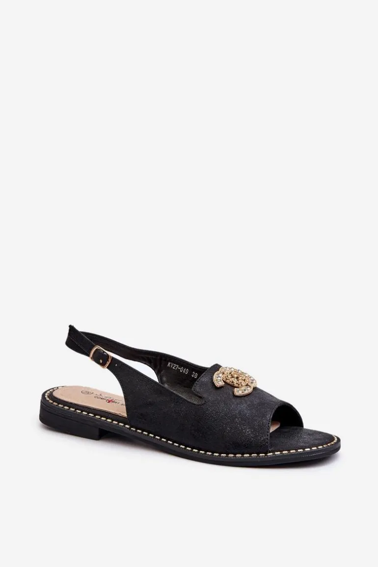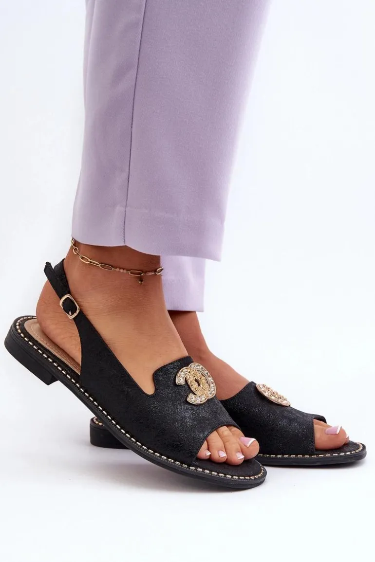 Sandały damskie wykonane z wysokiej jakości ekologicznej skóry. Z przodu złota ozdoba. Zapinane na regulowany pasek ze sprzączką Osadzone na płaskim obcasie. Miękka wkładka Comfort z naturalnej skóry zapewni wygodne użytkowanie obuwia. Przy wyborze rozmiaru prosimy kierować się tabelą rozmiarów.