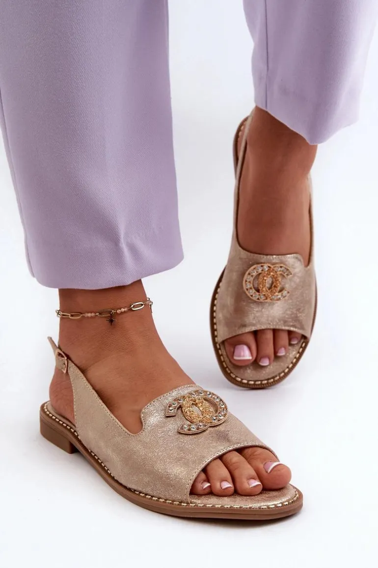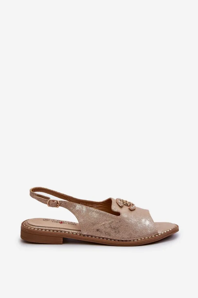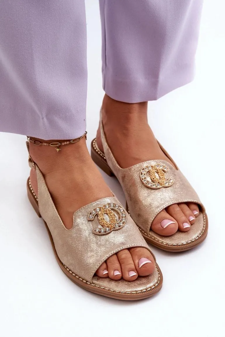 Sandały damskie wykonane z wysokiej jakości ekologicznej skóry. Z przodu złota ozdoba. Zapinane na regulowany pasek ze sprzączką Osadzone na płaskim obcasie. Miękka wkładka Comfort z naturalnej skóry zapewni wygodne użytkowanie obuwia. Przy wyborze rozmiaru prosimy kierować się tabelą rozmiarów.