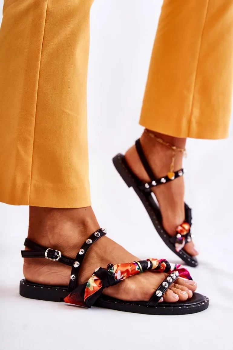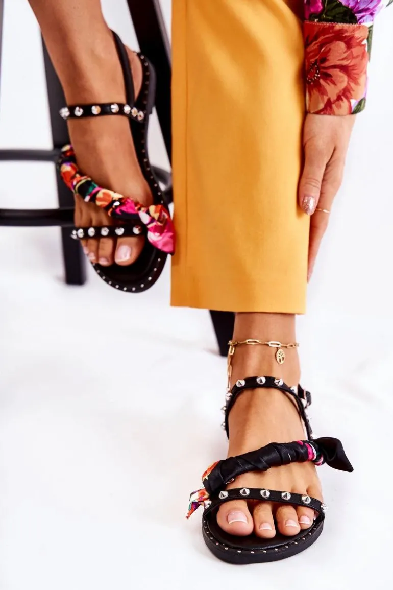 Sandały damskie na płaskim obcasie. Posiadają otwarty, zaokrąglony nosek oraz przyozdobioną ćwiekami podeszwę. Cienkie paski zostały wykonane z eko skóry i także przyozdobione ćwiekami. Model zapinany na sprzączkę z regulowanym paskiem, dzięki któremu możesz je odpowiednio dopasować do tęgości nogi. Dodatkowo jeden z pasków jest opleciony tkaniną w print, którą można zdjąć. Miękka wkładka wykonana z eko skóry. Sandały świetnie będą prezentować się z wieloma stylizacjami! Przy wyborze rozmiaru prosimy kierować się tabelą rozmiarów.