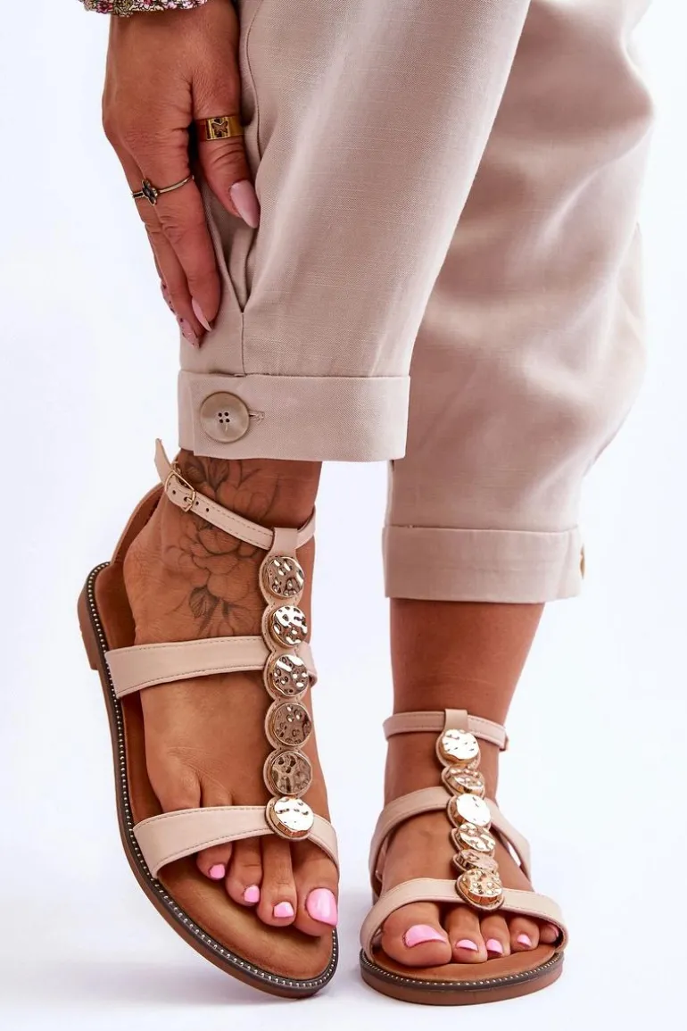 Sandały damskie zostały wykonane z eko skóry. Posiadają zdobienie w postaci kół na środkowym pasku. Zapinane wokół kostki na regulowany pasek ze sprzączką. Nosek odkryty, zaokrąglony. Wokół podeszwy znajdują się ozdobne ćwieki. Sandałki osadzono na płaskim obcasie, z podeszwą z gumowego tworzywa, która jest dodatkowo antypoślizgowa. Wygodna wkładka została wykonana z eko skóry. Przy wyborze rozmiaru prosimy kierować się tabelą rozmiarów.