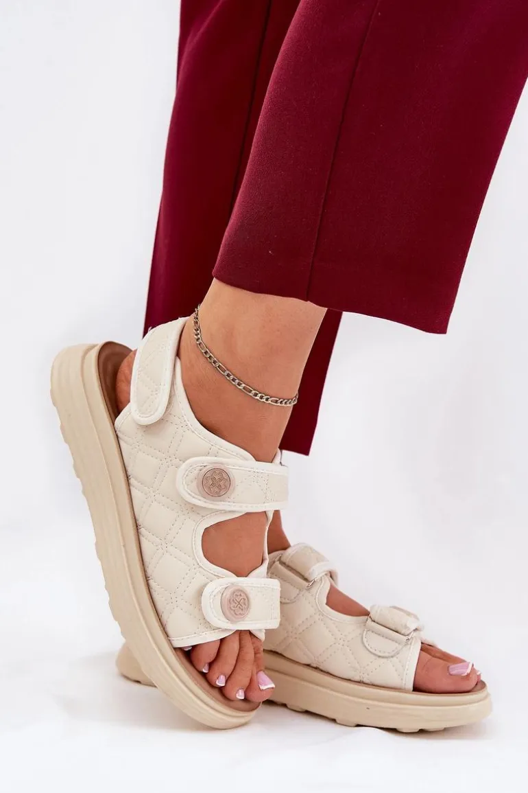 Stylowe sandały damskie z eko skóry. Osadzone na platformie, które zapewnia wygodę i modny wygląd. Zapięcie na trzy rzepy umożliwia idealne dopasowanie do stopy. Ozdobne detale nadają unikalnego charakteru. Doskonałe na lato, świetnie komponują się z letnimi sukienkami, spódnicami i spodniami, dodając każdej stylizacji lekkości i modnego wyglądu. Przy wyborze rozmiaru prosimy sugerować się tabelą rozmiarów.