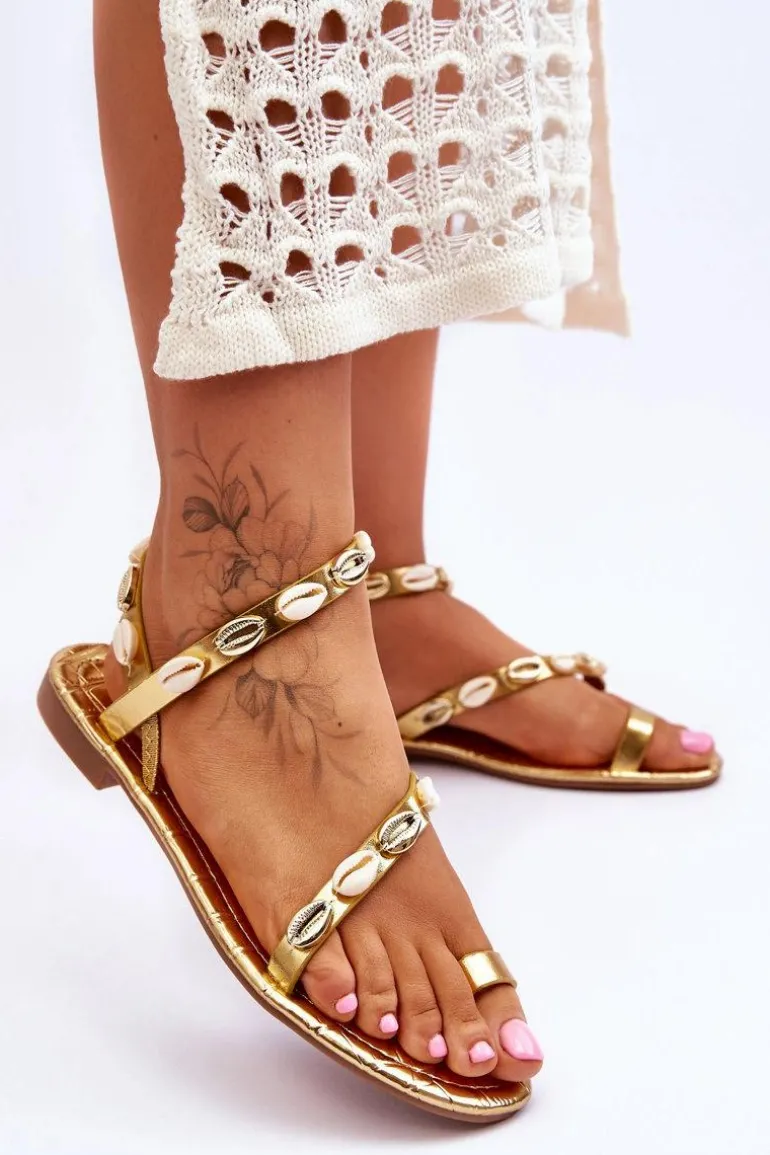 Damskie Sandały Z Ozdobnymi Muszelkami Złote Verdem