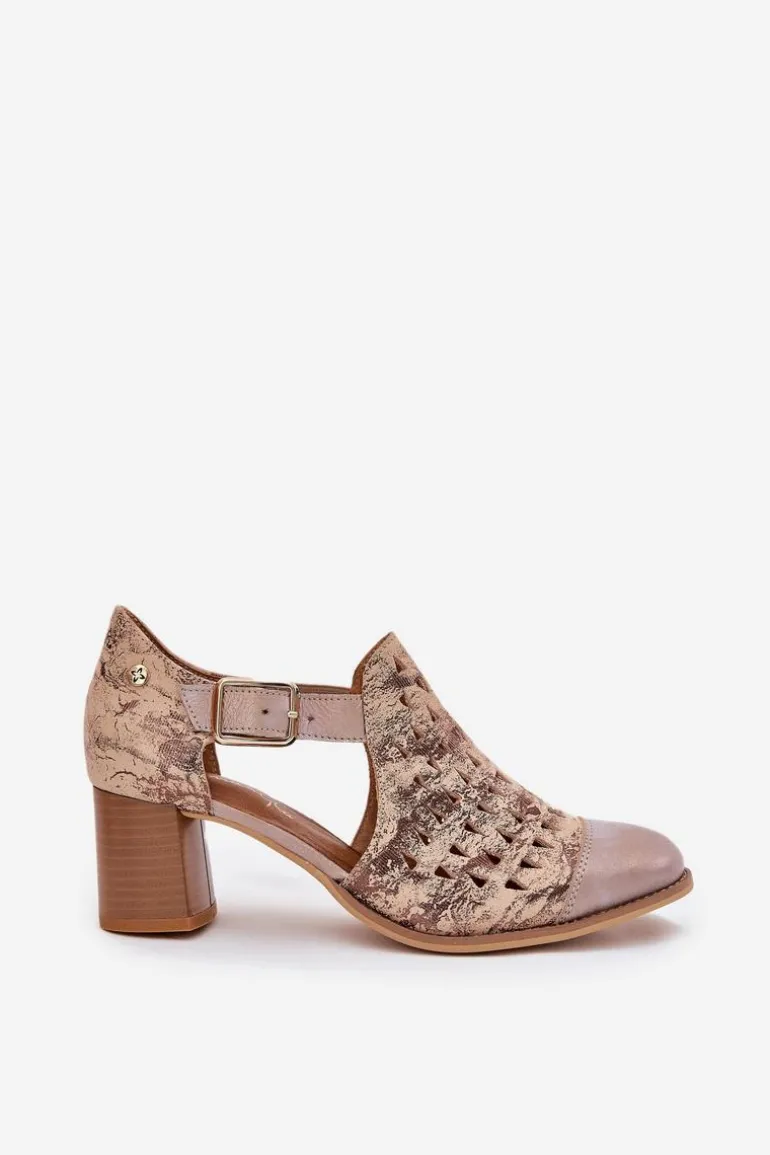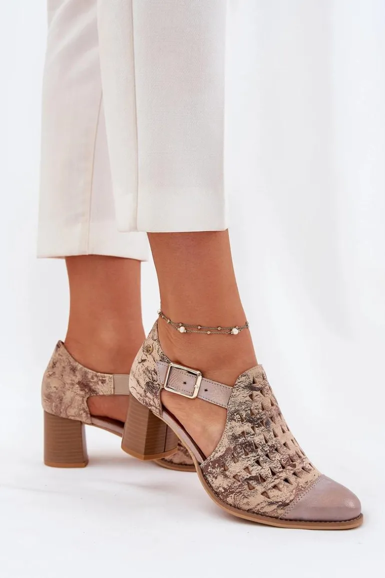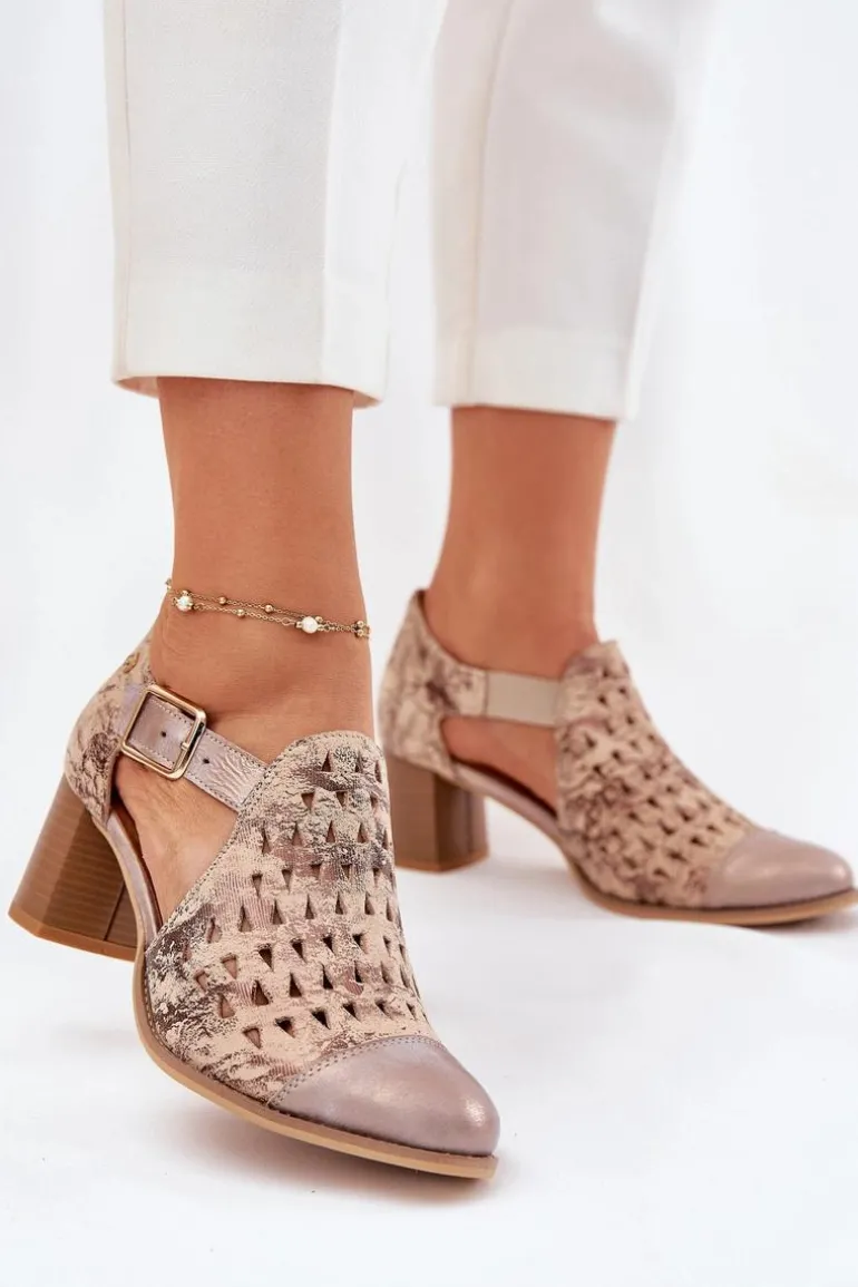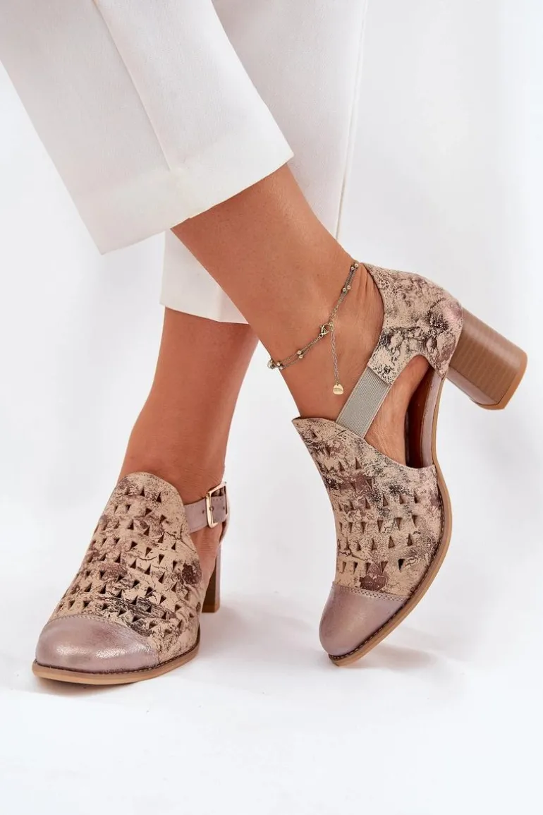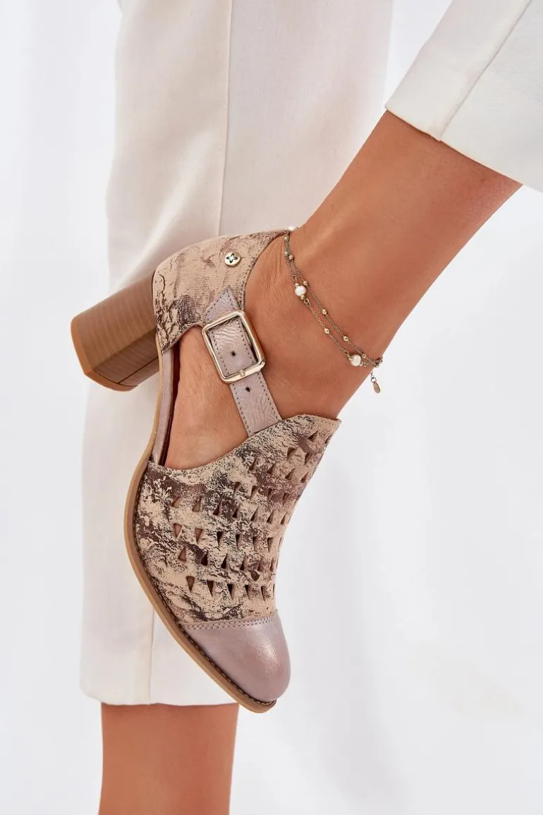 Botki z noskiem w kształcie migdała. Posiadają regulowany pasek zapinany przy kostce na sprzączkę oraz gumkę. Po bokach cholewki znajdują się efektowne wycięcia. Wykonane z naturalnej skóry. Posiadają usztywniany zapiętek. Urozmaicone ażurowym wzorem na przodzie cholewki. Miękka, skórzana wkładka pozwoli na komfortowe użytkowanie obuwia, nawet przez cały dzień! Obcas w postaci stabilnego słupka. Przy wyborze rozmiaru prosimy sugerować się tabelą rozmiarów.