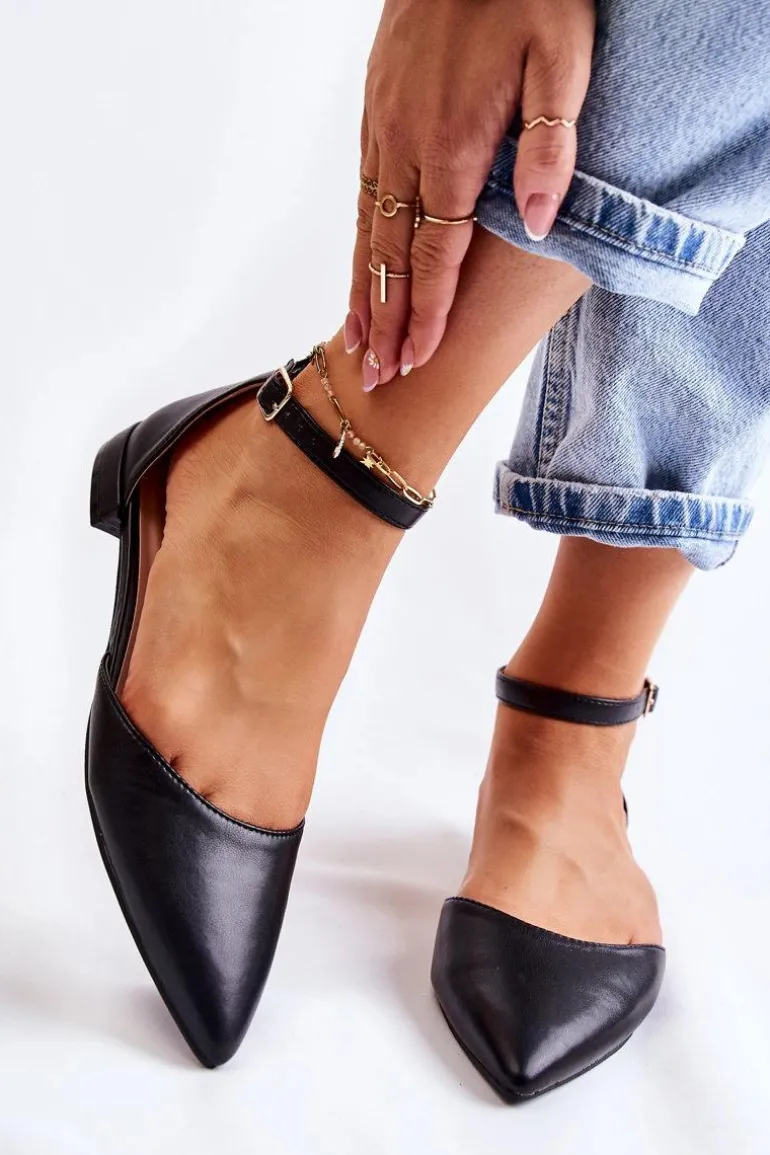 Niezwykłe baleriny w formie sandałek. Modny fason świetnie sprawdzi się podczas upalnych dni. Zostały wykonane z eko skóry. Posiadają zapinanie na regulowany pasek ze sprzączką. Miękka, eko skórzana wkładka zapewni komfort podczas użytkowania. Osadzone na niskim obcasie. Dodatkowo buty te posiadają usztywniany zapiętek. Nosek w szpic. Podczas wyboru rozmiaru prosimy sugerować się tabelą rozmiarów.