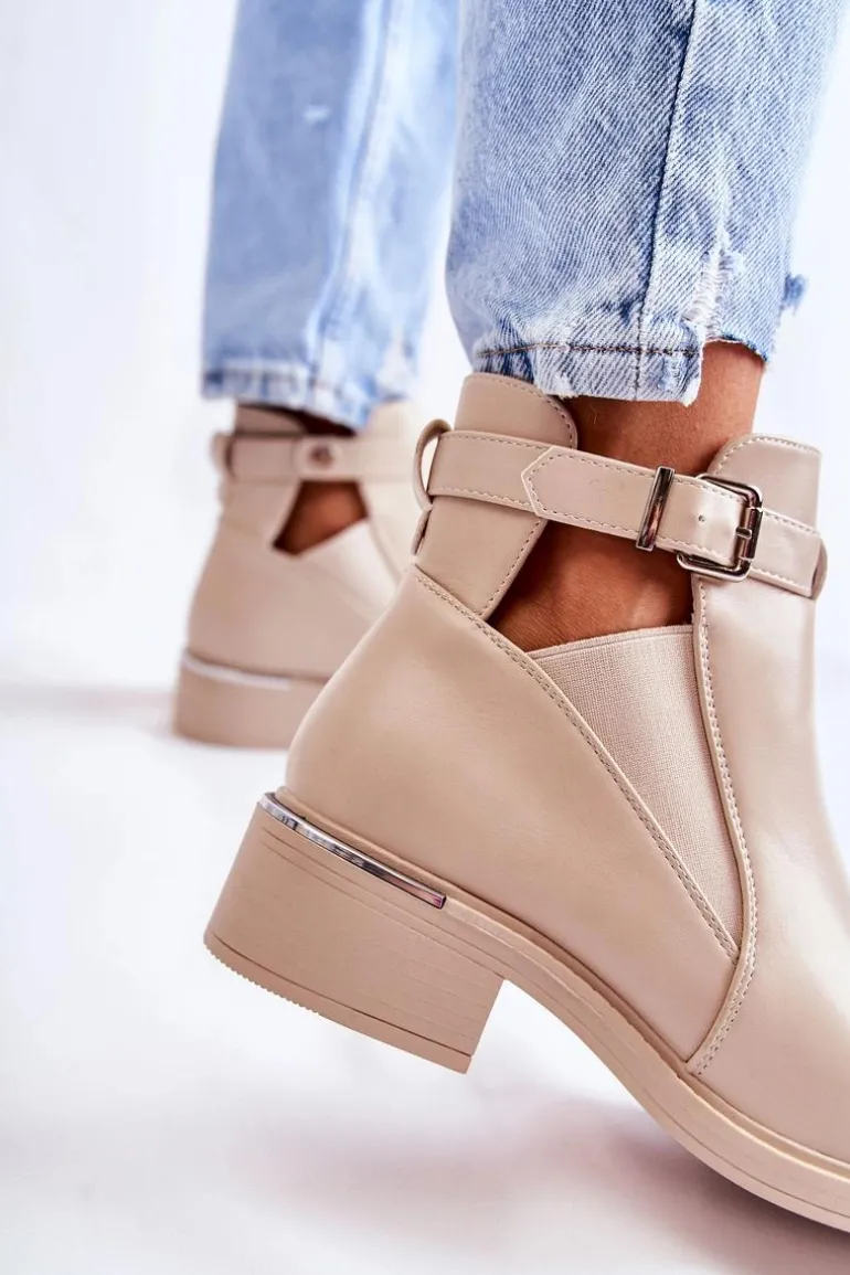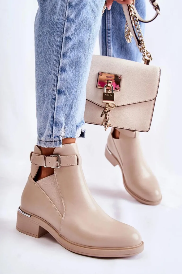 Modne botki damskie z delikatnymi wycięciami po bokach cholewki oraz gumkami pozwalającymi na odpowiednie dopasowanie obuwia do tęgości nogi. Model ten został wykonany z eko skóry. Wkładka materiałowa. Dodatkowo buty posiadają usztywniany zapiętek. Pasek zapinany na napę oraz sprzączkę, który można ściągnąć. Osadzone na płaskim obcasie. Przy wyborze rozmiaru prosimy sugerować się tabelą rozmiarów.
