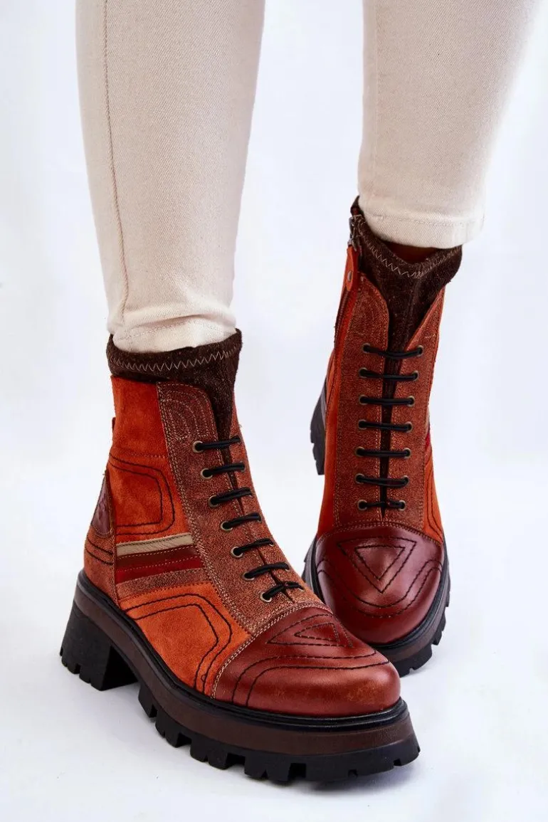 Modne, damskie botki marki Maciejka zostały wykonane z wysokiej jakości naturalnych skór oraz materiału tekstylnego. Posiadają klasyczne suwak z boku cholewki oraz gumki imitujące sznurówki. Model ten posiada usztywniany zapiętek oraz ocieplaną wkładkę. Botki osadzono na płaskim obcasie oraz masywnej platformie z bieżnikiem. Przy wyborze rozmiaru prosimy sugerować się tabelą rozmiarów.