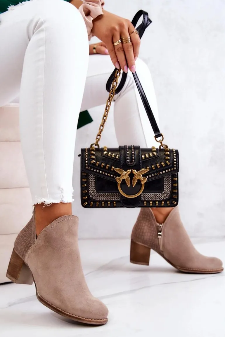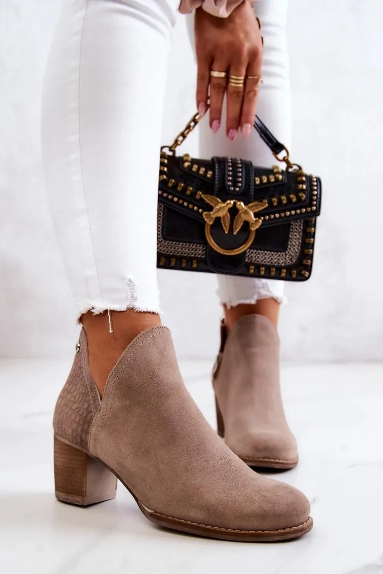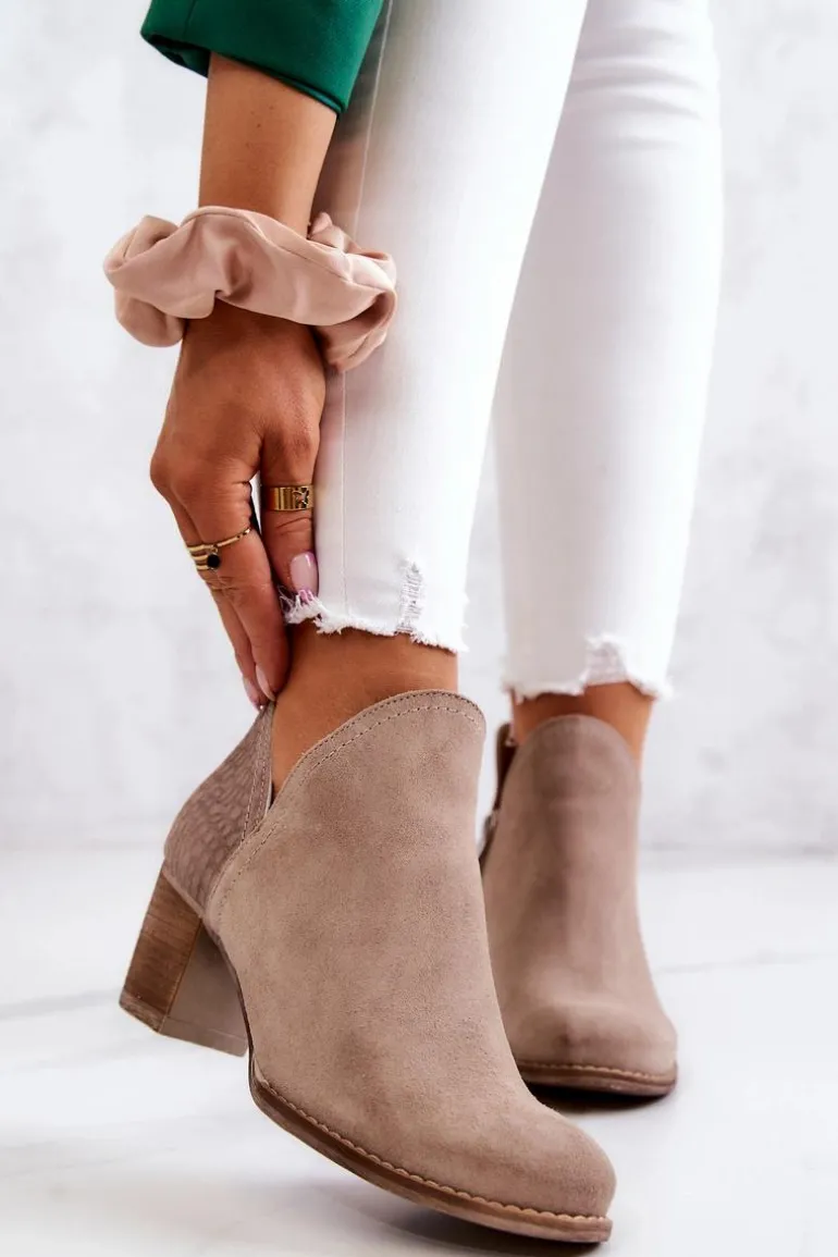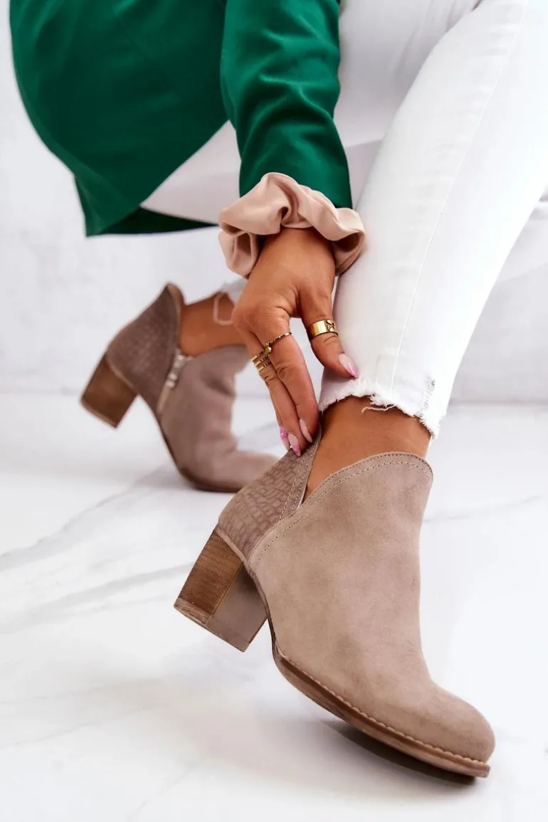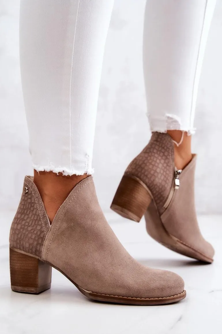 Wyjątkowe botki wykonane z naturalnej zamszowej skóry. Wnętrze zostało pokryte skórą naturalną i materiałem tekstylnym, co sprawia, że są bardzo komfortowe podczas użytkowania. Miękka, skórzana wkładka wykonana została ze skóry naturalnej. Z boku cholewki znajduje się zamek błyskawiczny, który ułatwia zakładanie obuwia. Obcas w postaci słupka zapewnia stabilizację. Tłoczona faktura oraz modny fason w stylu kowbojek zachwyci każdego.Przy wyborze rozmiaru prosimy sugerować się tabelą rozmiarów.