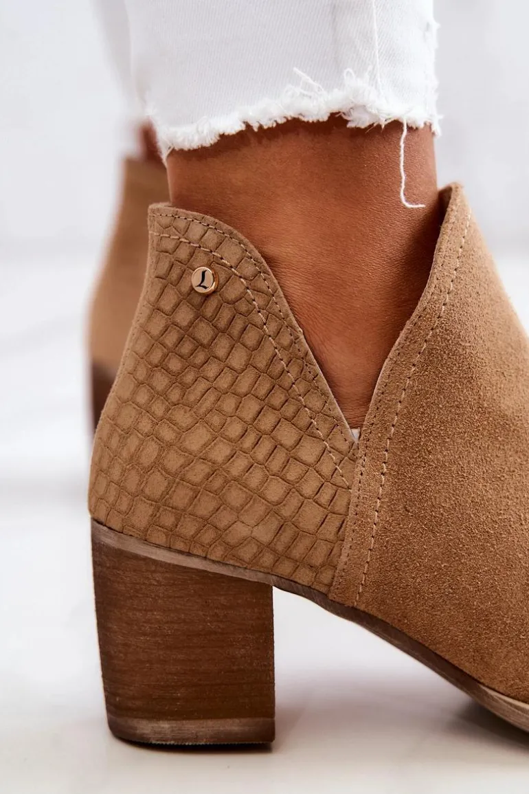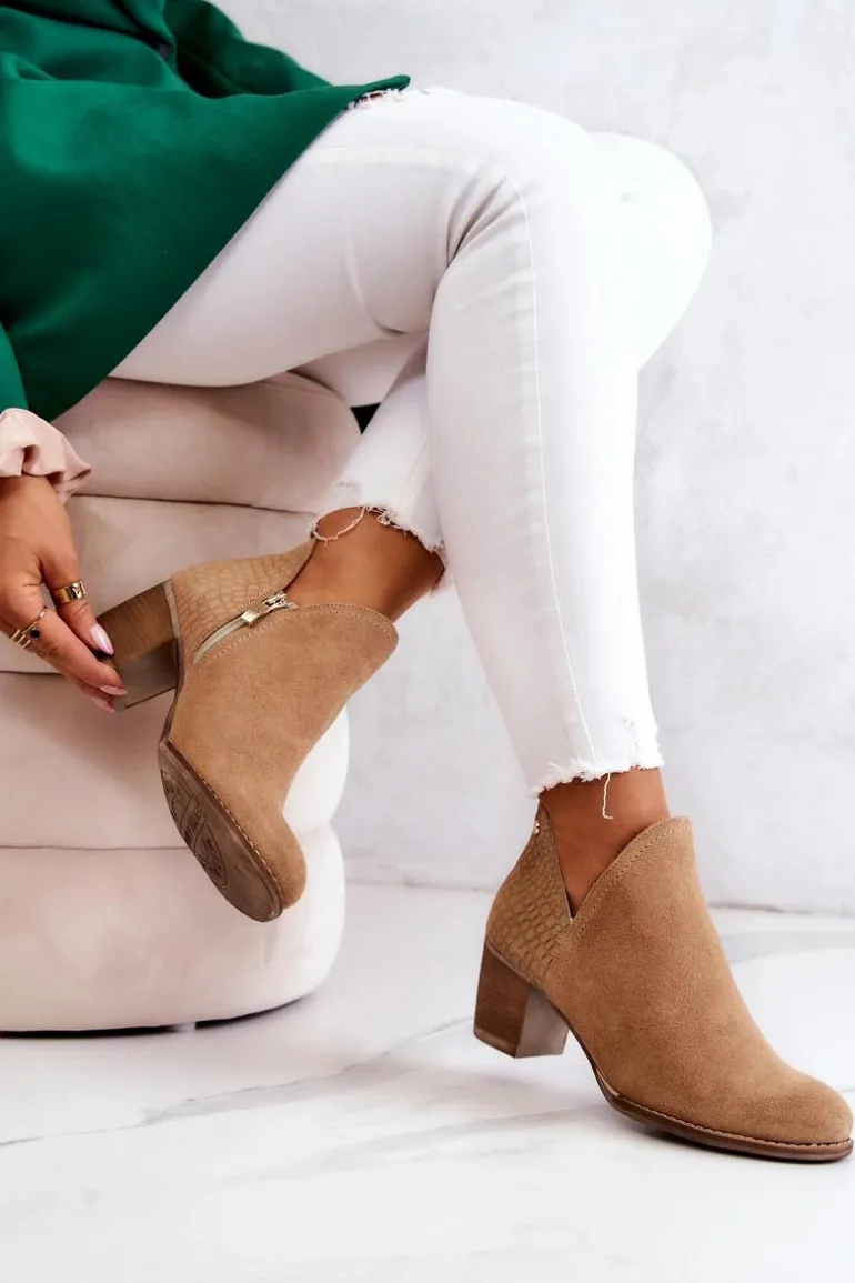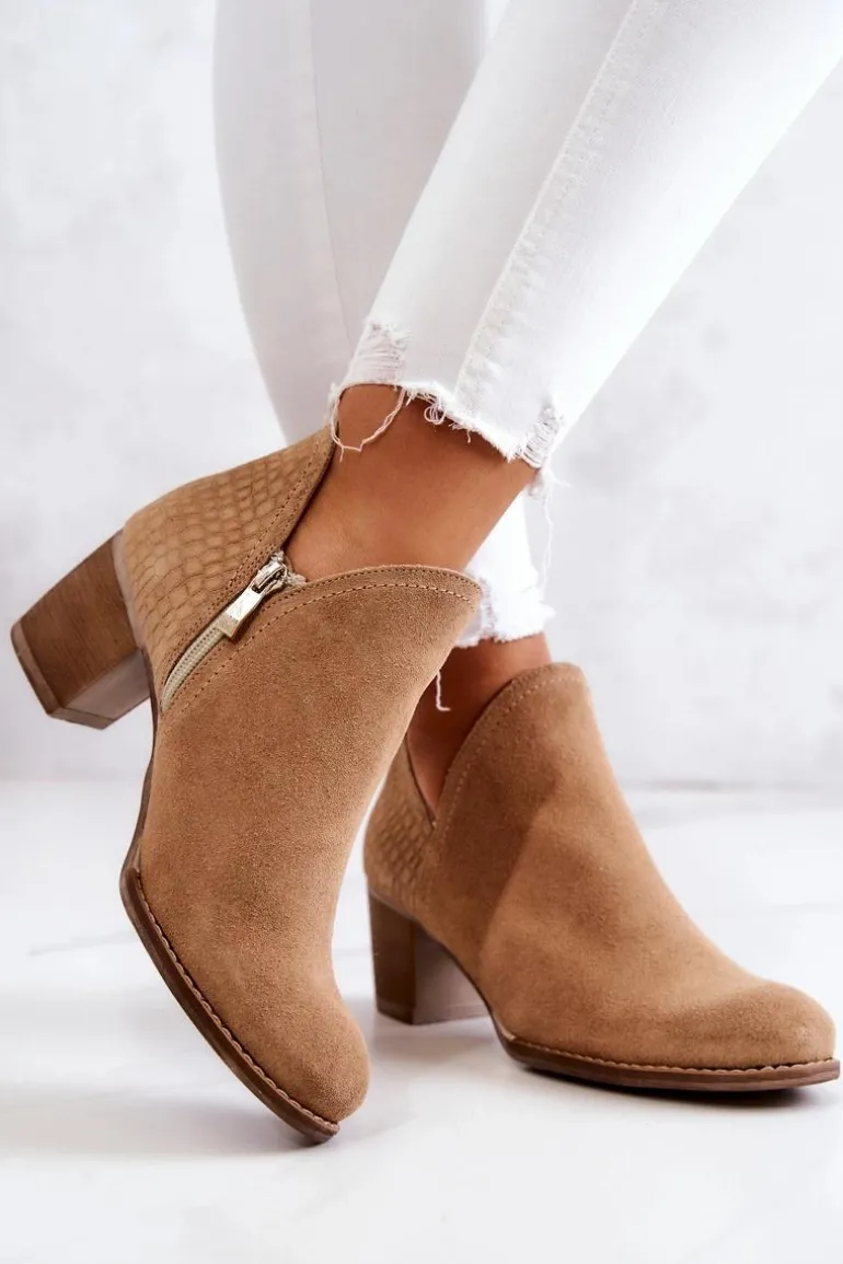 Wyjątkowe botki wykonane z naturalnej zamszowej skóry. Wnętrze zostało pokryte skórą naturalną i materiałem tekstylnym, co sprawia, że są bardzo komfortowe podczas użytkowania. Miękka, skórzana wkładka wykonana została ze skóry naturalnej. Z boku cholewki znajduje się zamek błyskawiczny, który ułatwia zakładanie obuwia. Obcas w postaci słupka zapewnia stabilizację. Tłoczona faktura oraz modny fason w stylu kowbojek zachwyci każdego.Przy wyborze rozmiaru prosimy sugerować się tabelą rozmiarów.