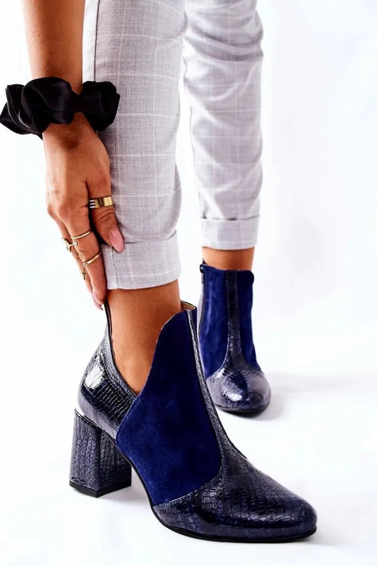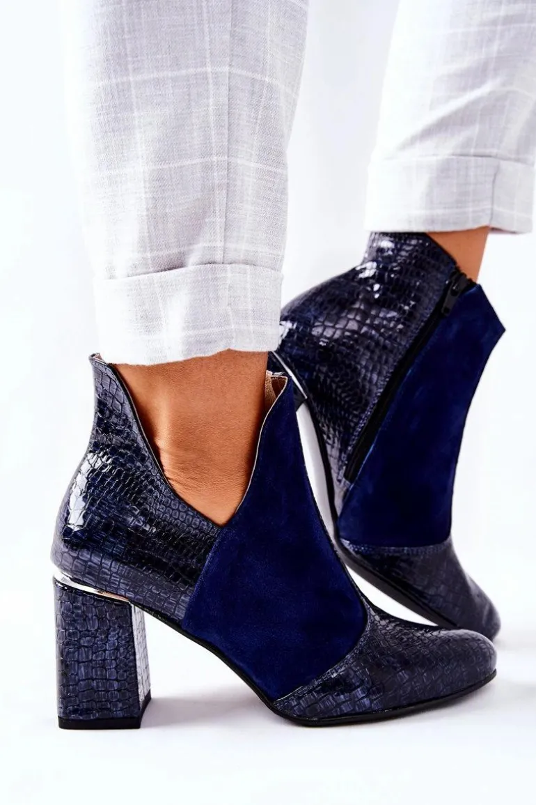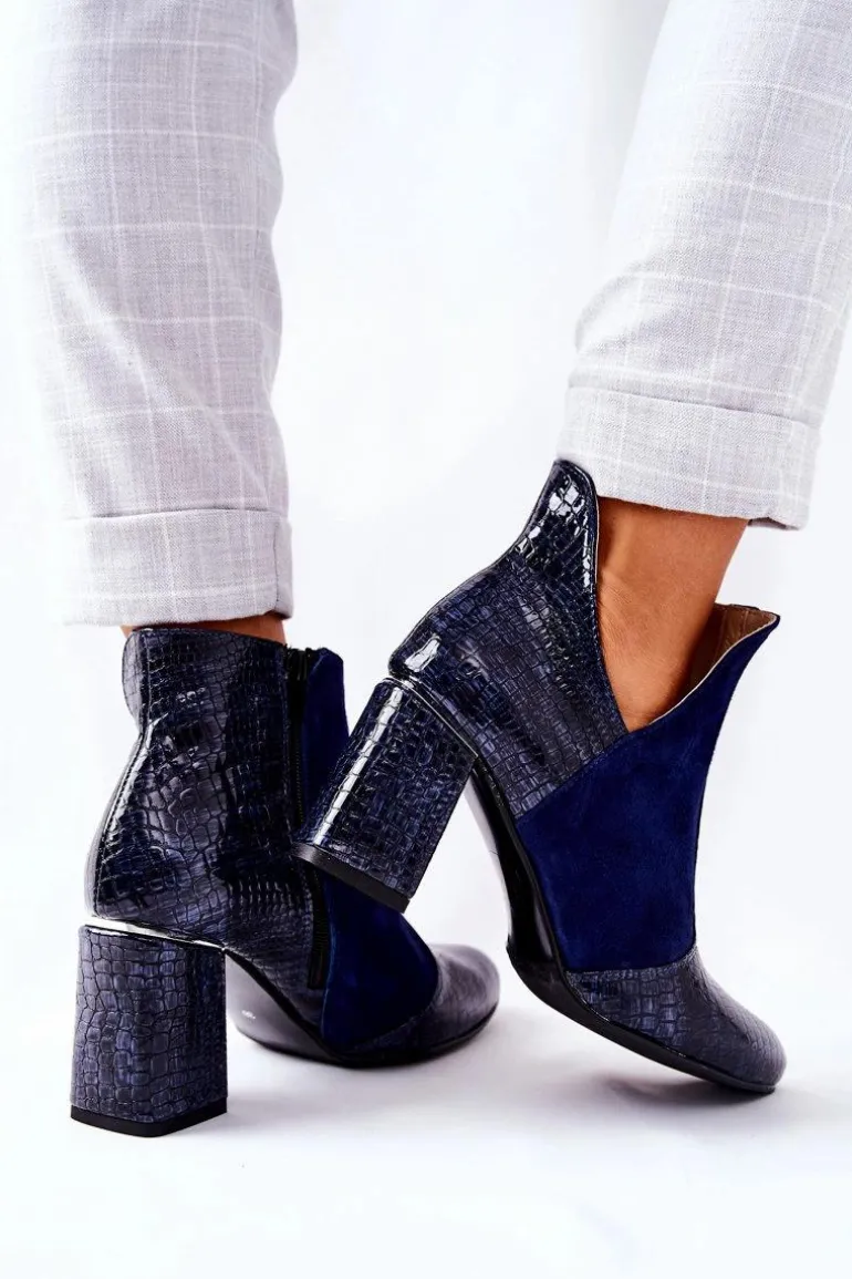 Damskie Skórzane Botki Na Słupku Granatowe I Wish