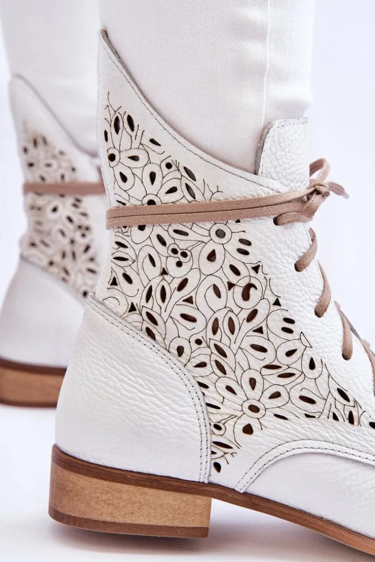 Niezwykle wygodne botki damskie zostały wykonane z wysokiej jakości naturalnej skóry. Dodatkowo ozdobiono je ażurowym wzorkiem. Zapinane z boku cholewki na suwak oraz sznurowane. Dodatkowo botki posiadają usztywniany zapiętek oraz miękką, skórzaną wkładkę. Osadzone na płaskim obcasie, co sprawia, że są niezwykle stabilne. Przy wyborze rozmiaru prosimy sugerować się tabelą rozmiarów.