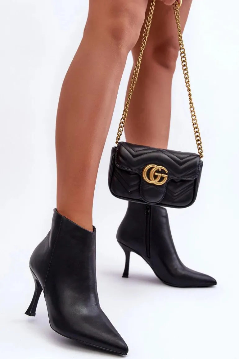 Eleganckie botki damskie zostały wykonane z eko skóry. Model osadzony na obcasie w postaci szpilki, z noskiem w szpic świetnie wysmukli nogi. Botki są zapinane z boku na suwak. Zapiętek w tych botkach jest usztywniany. Model ten świetnie sprawdzi się w wielu stylizacjach np.: do sukienek, spódnic czy spodni. Te botki koniecznie powinny znaleźć się w Twojej szafie! Przy wyborze rozmiaru prosimy sugerować się tabelą rozmiarów.