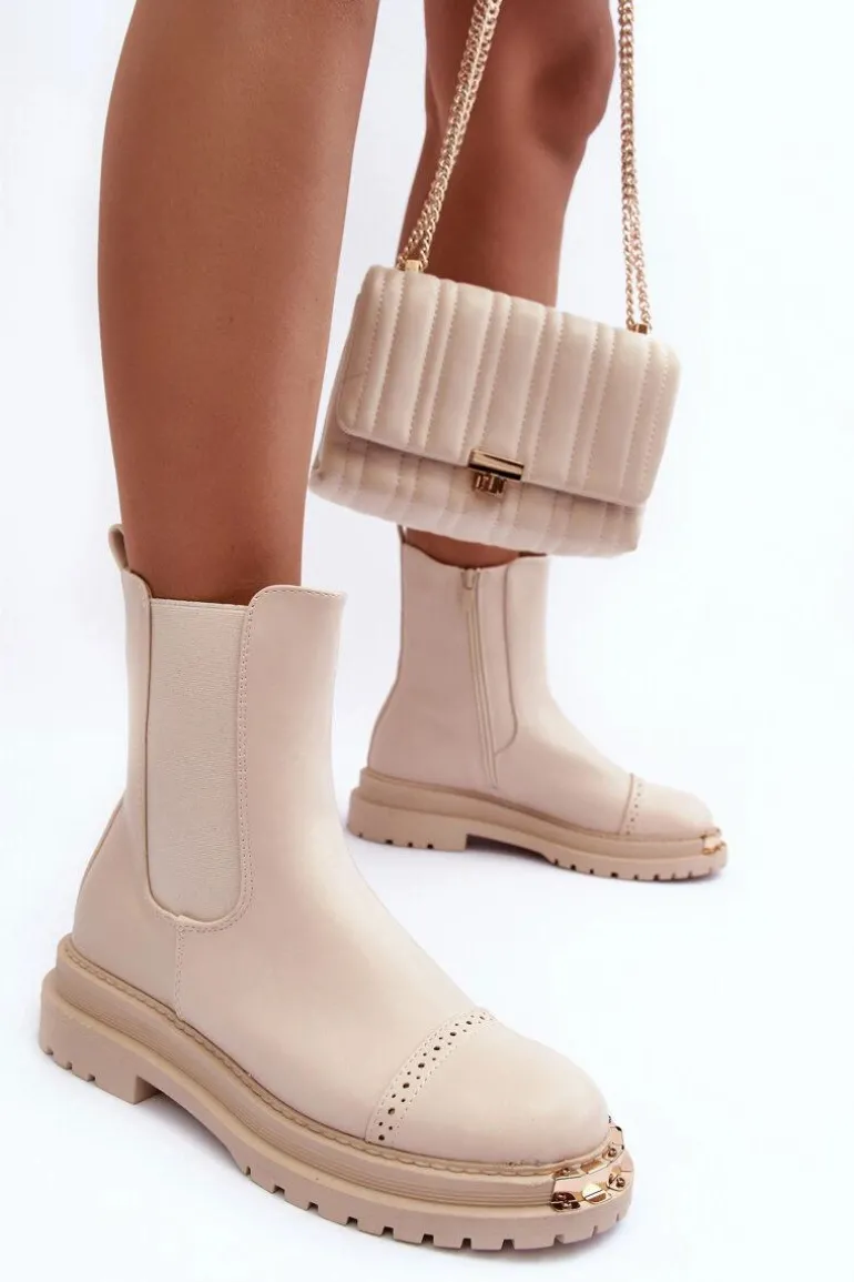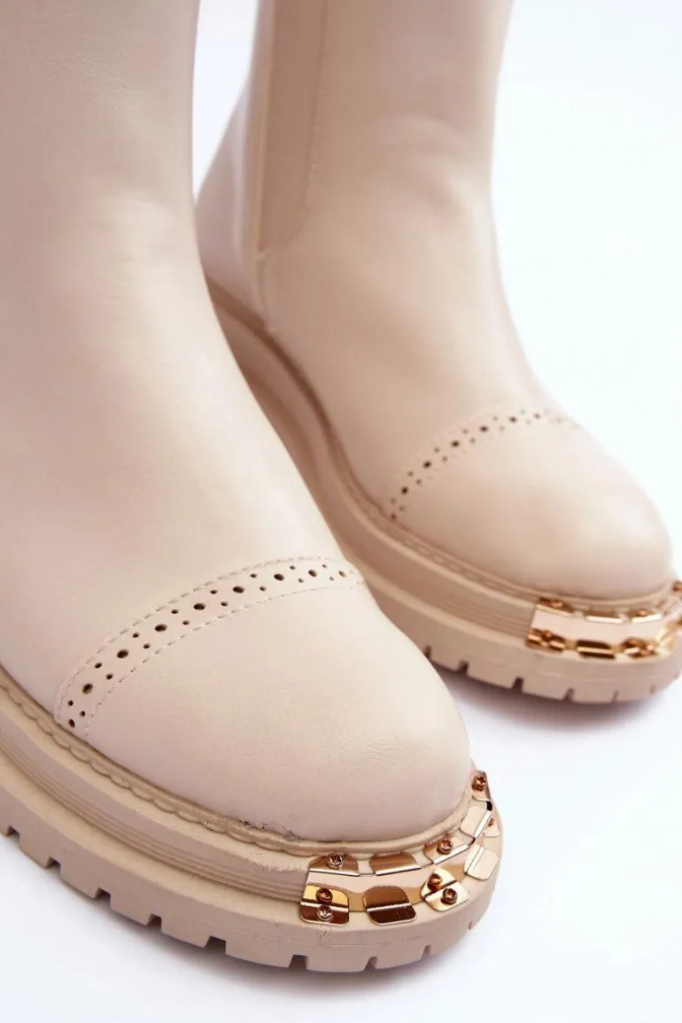 Damskie sztyblety zostały wykonane z eko skóry. Zapinane na suwak po wewnętrznej stronie cholewki. Osadzone na płaskim obcasie i platformie. Z przodu złota ozdoba z tworzywa sztucznego. Noski zaokrąglone. Ten model powinien znaleźć się w Twojej szafie! Przy wyborze rozmiaru prosimy sugerować się tabelą rozmiarów.